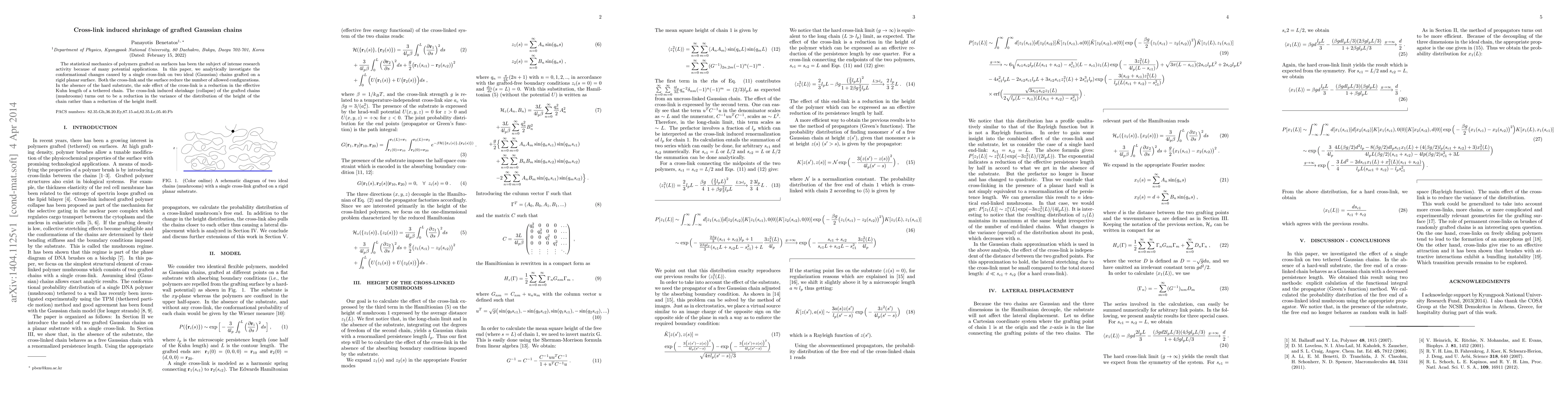 The statistical mechanics of polymers grafted on surfaces has been the subject of intense research activity because of many potential applications. In this paper, we analytically investigate the conformational changes caused by a single cross-link on two ideal (Gaussian) chains grafted on a rigid planar surface. Both the cross-link and the surface reduce the number of allowed configurations. In the absence of the hard substrate, the sole effect of the cross-link is a reduction in the effective Kuhn length of a tethered chain. The cross-link induced shrinkage (collapse) of the grafted chains (mushrooms) turns out to be a reduction in the variance of the distribution of the height of the chain rather than a reduction of the height itself.