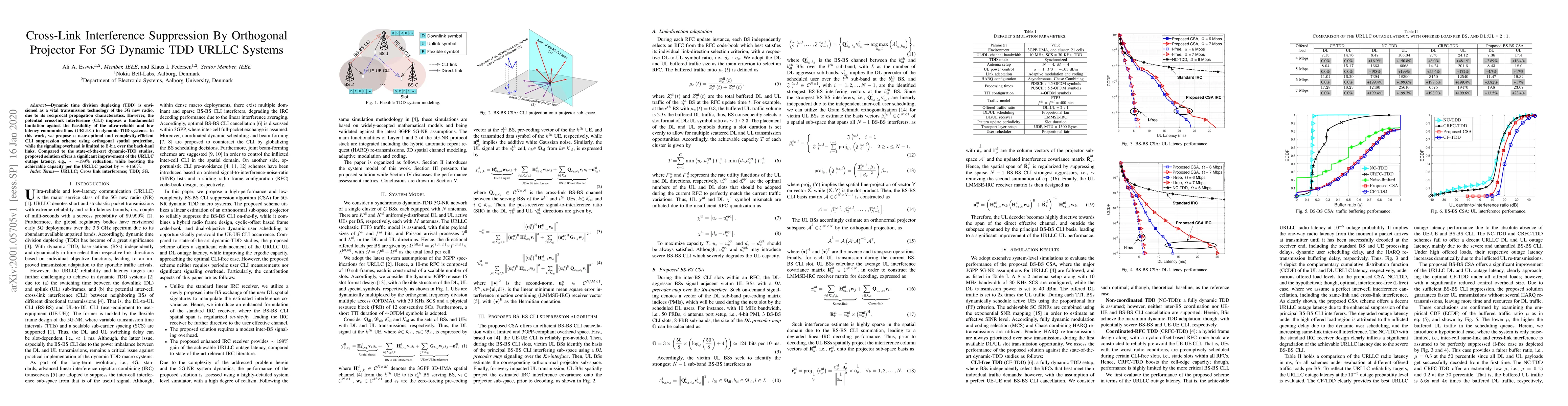 This paper proposes a near-optimal, complexity-efficient scheme for suppressing cross-link interference in dynamic TDD 5G systems using orthogonal spatial projection, significantly reducing URLLC outage latency by -199% and boosting capacity by +156%. The method limits signaling overhead to B-bit over backhaul links.