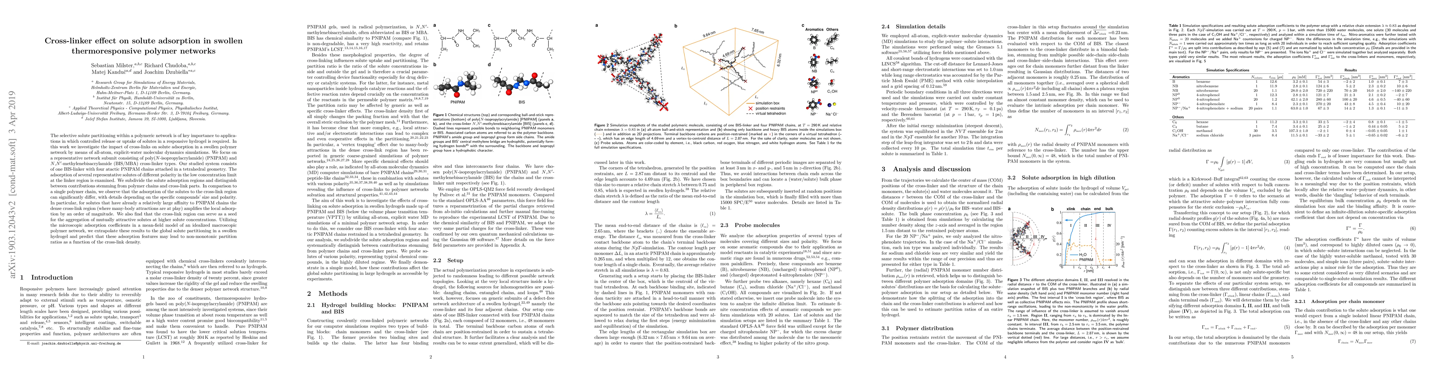 This study uses molecular dynamics simulations to explore how cross-links in thermoresponsive polymer networks affect solute adsorption, finding that cross-link regions significantly enhance adsorption for solutes with high affinity to polymer chains, potentially leading to non-monotonic partition ratios in hydrogels.