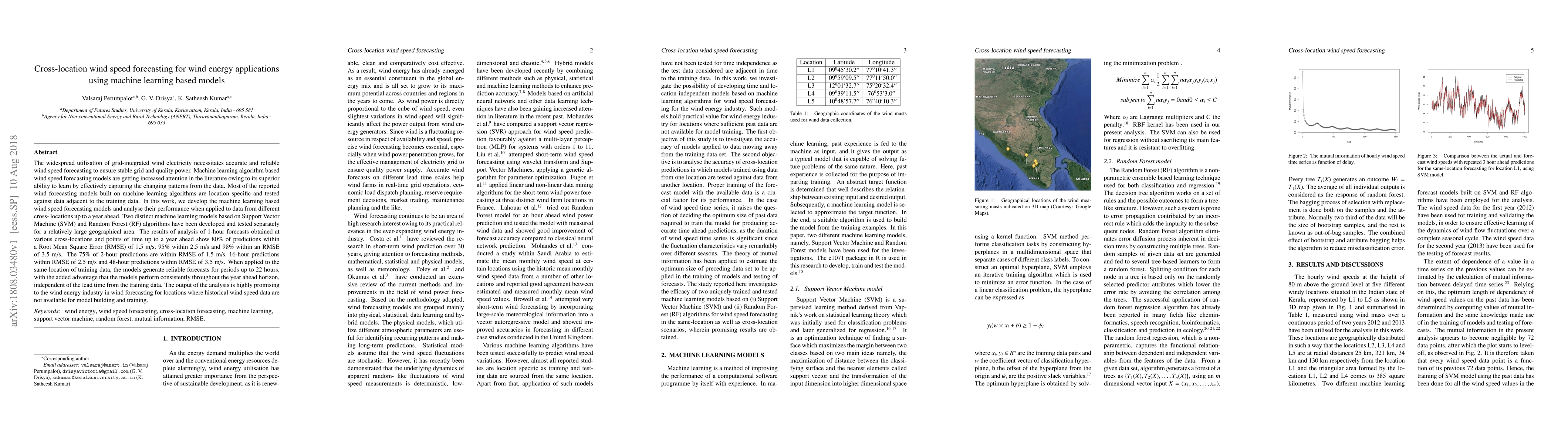 This paper develops machine learning models based on SVM and RF for cross-location wind speed forecasting, achieving reliable predictions up to a year ahead with 80% of 1-hour forecasts within 1.5 m/s RMSE. The models show consistent performance across different locations and times, offering valuable insights for wind energy applications in regions lacking historical data.