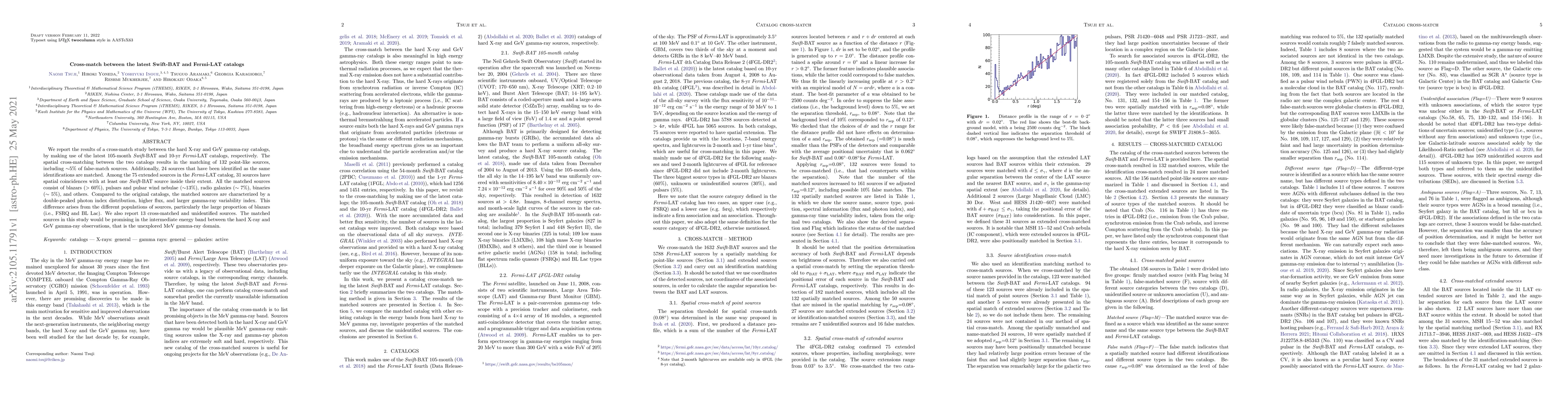 This study cross-matches the latest Swift-BAT and Fermi-LAT catalogs, identifying 132 point-like sources with ~5% false matches, and finds spatial coincidences for 31 extended Fermi-LAT sources with Swift-BAT sources. The matched sources predominantly consist of blazars, pulsars, and other types, showing distinct characteristics like double-peaked photon index distribution and higher flux.