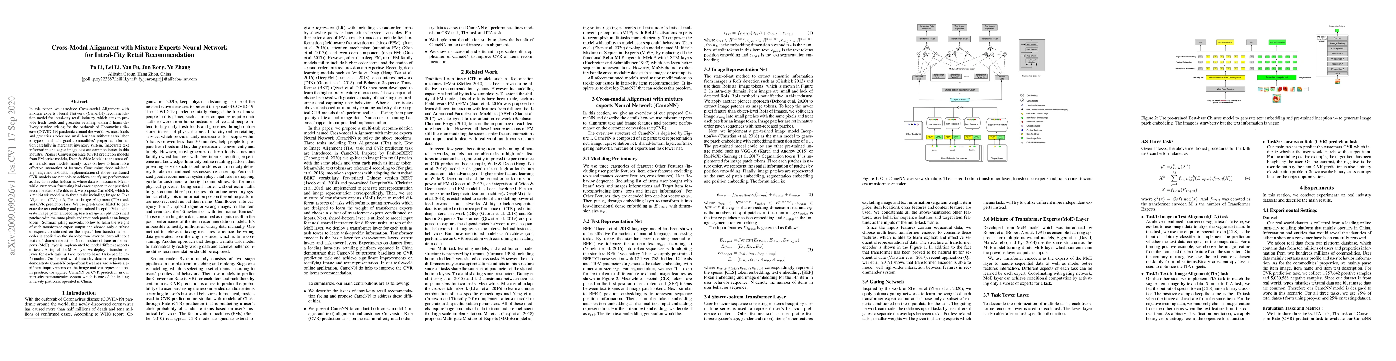 This paper introduces CameNN, a Cross-modal Alignment with Mixture Experts Neural Network for intra-city retail recommendation, designed to enhance fresh food and grocery delivery services. The model integrates image and text alignment tasks and CVR prediction, leveraging pre-trained BERT and InceptionV4, and demonstrates superior performance over baselines on real-world data.