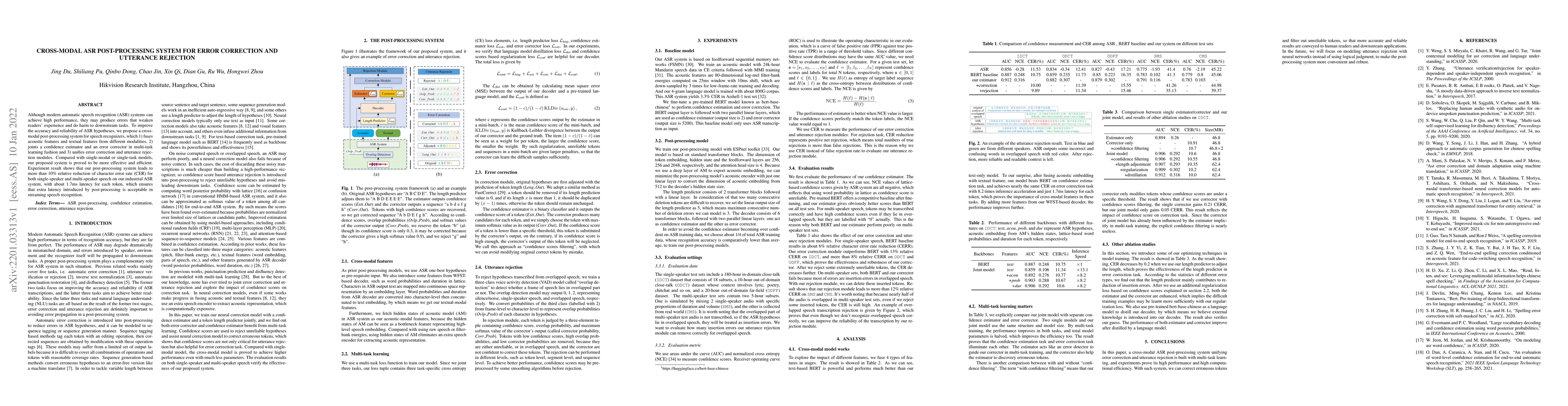 This paper proposes a cross-modal post-processing system to improve automatic speech recognition (ASR) accuracy by fusing acoustic and textual features, integrating confidence estimation and error correction, and combining error correction with utterance rejection. Experimental results show a more than 10% reduction in character error rate with acceptable additional latency.