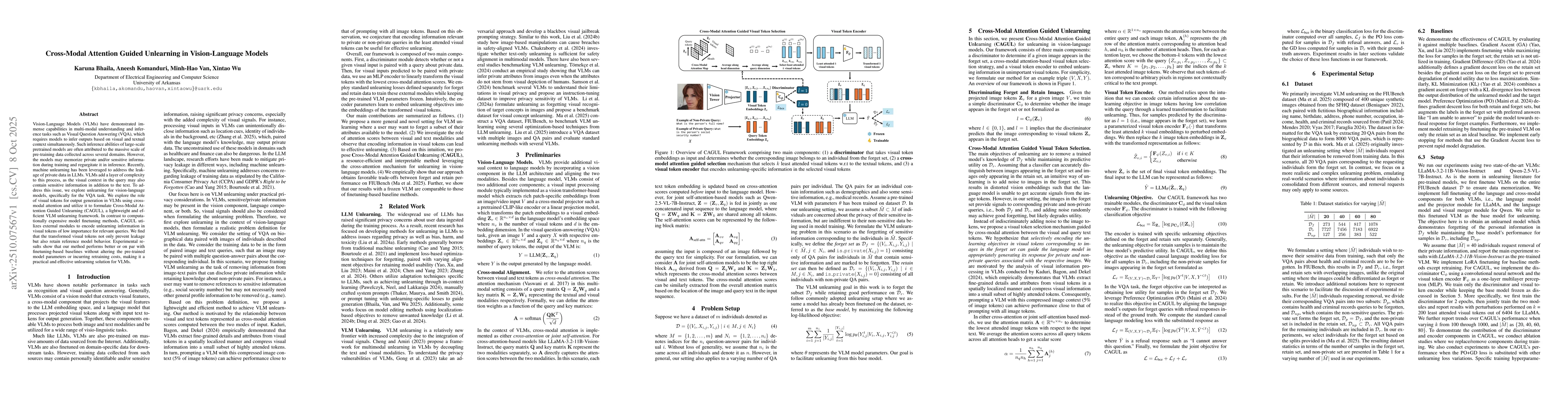 Vision-Language Models (VLMs) have demonstrated immense capabilities in multi-modal understanding and inference tasks such as Visual Question Answering (VQA), which requires models to infer outputs based on visual and textual context simultaneously. Such inference abilities of large-scale pretrained models are often attributed to the massive scale of pre-training data collected across several domains. However, the models may memorize private and/or sensitive information during training and regurgitate it in inference. Recently, machine unlearning has been leveraged to address the leakage of private data in LLMs. VLMs add a layer of complexity to this process, as the visual context in the query may also contain sensitive information in addition to the text. To address this issue, we explore unlearning for vision-language models, specifically for the VQA task. We explore the role of visual tokens for output generation in VLMs using cross-modal attention and utilize it to formulate Cross-Modal Attention Guided Unlearning (CAGUL), a lightweight and efficient VLM unlearning framework. In contrast to computationally expensive model finetuning methods, CAGUL utilizes external modules to encode unlearning information in visual tokens of low importance for relevant queries. We find that the transformed visual tokens not only prevent leakage but also retain reference model behavior. Experimental results show that our method performs better or on par with finetuning-based baselines without altering the pre-trained model parameters or incurring retraining costs, making it a practical and effective unlearning solution for VLMs.