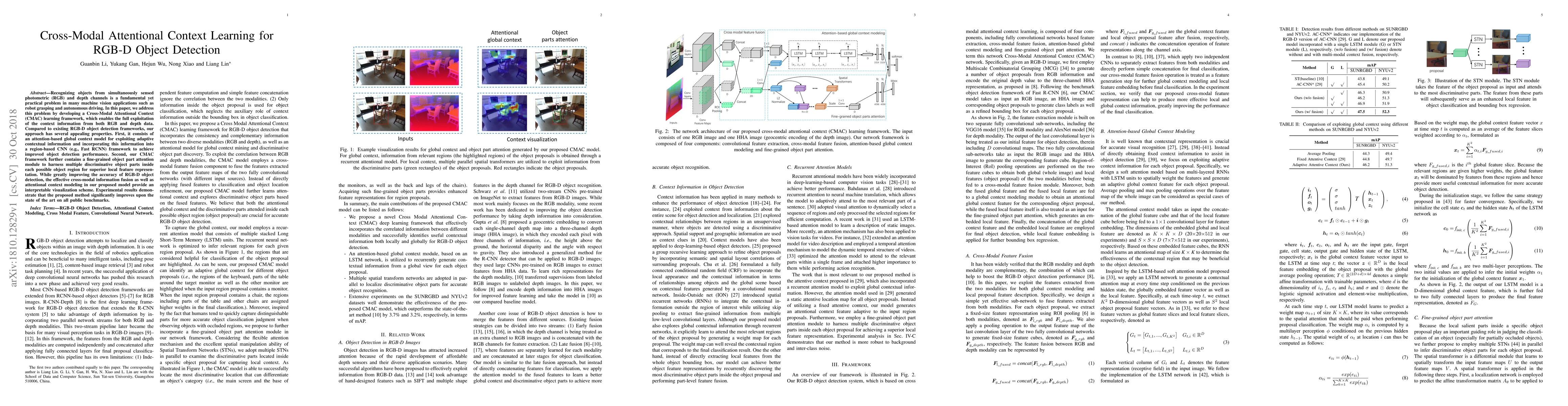 This paper introduces a Cross-Modal Attentional Context (CMAC) learning framework for RGB-D object detection, utilizing attention-based global context modeling and fine-grained object part attention to enhance feature representation and detection accuracy. The method outperforms existing frameworks and provides an interpretable visualization of cross-modal information fusion.