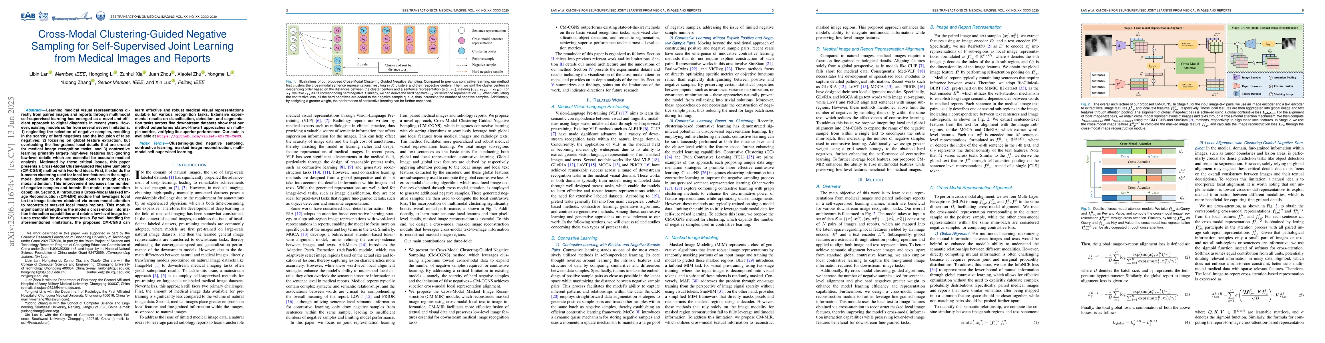 Learning medical visual representations directly from paired images and reports through multimodal self-supervised learning has emerged as a novel and efficient approach to digital diagnosis in recent years. However, existing models suffer from several severe limitations. 1) neglecting the selection of negative samples, resulting in the scarcity of hard negatives and the inclusion of false negatives; 2) focusing on global feature extraction, but overlooking the fine-grained local details that are crucial for medical image recognition tasks; and 3) contrastive learning primarily targets high-level features but ignoring low-level details which are essential for accurate medical analysis. Motivated by these critical issues, this paper presents a Cross-Modal Cluster-Guided Negative Sampling (CM-CGNS) method with two-fold ideas. First, it extends the k-means clustering used for local text features in the single-modal domain to the multimodal domain through cross-modal attention. This improvement increases the number of negative samples and boosts the model representation capability. Second, it introduces a Cross-Modal Masked Image Reconstruction (CM-MIR) module that leverages local text-to-image features obtained via cross-modal attention to reconstruct masked local image regions. This module significantly strengthens the model's cross-modal information interaction capabilities and retains low-level image features essential for downstream tasks. By well handling the aforementioned limitations, the proposed CM-CGNS can learn effective and robust medical visual representations suitable for various recognition tasks. Extensive experimental results on classification, detection, and segmentation tasks across five downstream datasets show that our method outperforms state-of-the-art approaches on multiple metrics, verifying its superior performance.