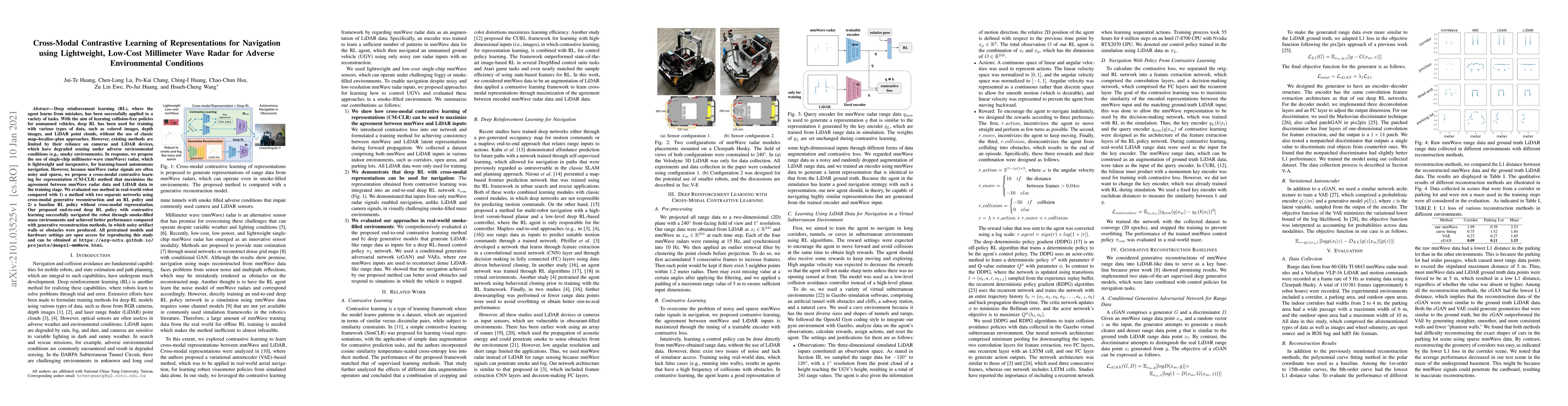 This paper proposes using lightweight, low-cost millimeter-wave radar for autonomous navigation in adverse conditions, employing cross-modal contrastive learning to enhance representation agreement between radar and LiDAR data. The method outperforms generative reconstruction and baseline RL in navigating smoke-filled mazes.