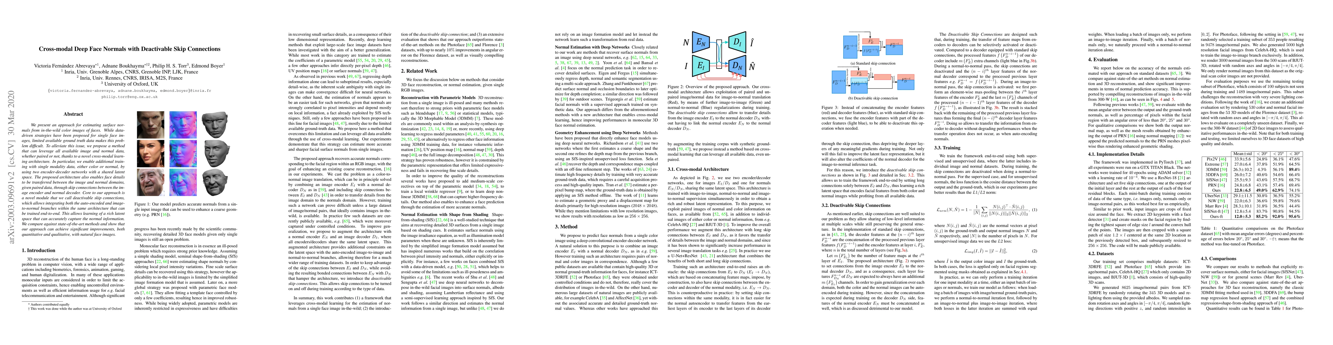 We present an approach for estimating surface normals from in-the-wild color images of faces. While data-driven strategies have been proposed for single face images, limited available ground truth data makes this problem difficult. To alleviate this issue, we propose a method that can leverage all available image and normal data, whether paired or not, thanks to a novel cross-modal learning architecture. In particular, we enable additional training with single modality data, either color or normal, by using two encoder-decoder networks with a shared latent space. The proposed architecture also enables face details to be transferred between the image and normal domains, given paired data, through skip connections between the image encoder and normal decoder. Core to our approach is a novel module that we call deactivable skip connections, which allows integrating both the auto-encoded and image-to-normal branches within the same architecture that can be trained end-to-end. This allows learning of a rich latent space that can accurately capture the normal information. We compare against state-of-the-art methods and show that our approach can achieve significant improvements, both quantitative and qualitative, with natural face images.