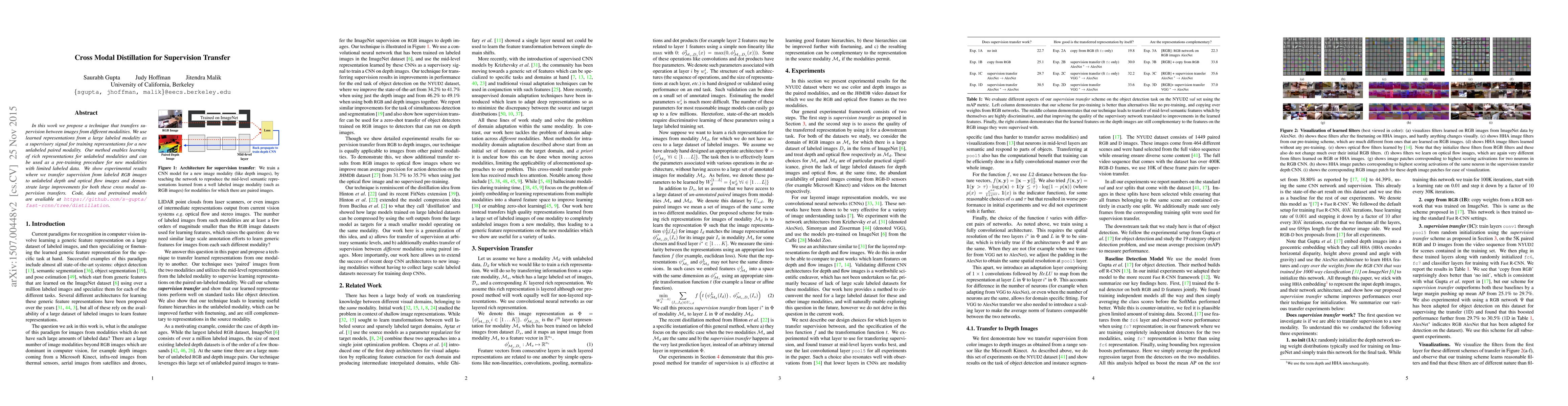 In this work we propose a technique that transfers supervision between images from different modalities. We use learned representations from a large labeled modality as a supervisory signal for training representations for a new unlabeled paired modality. Our method enables learning of rich representations for unlabeled modalities and can be used as a pre-training procedure for new modalities with limited labeled data. We show experimental results where we transfer supervision from labeled RGB images to unlabeled depth and optical flow images and demonstrate large improvements for both these cross modal supervision transfers. Code, data and pre-trained models are available at https://github.com/s-gupta/fast-rcnn/tree/distillation