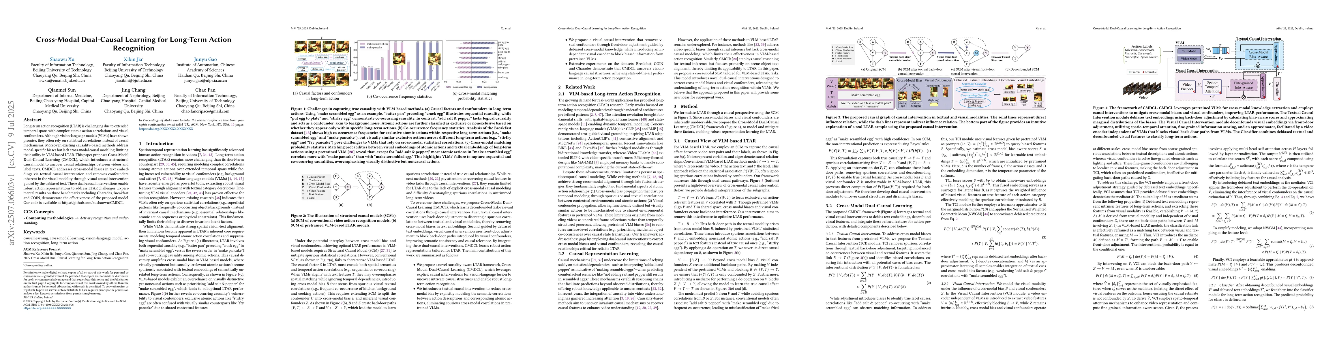 Long-term action recognition (LTAR) is challenging due to extended temporal spans with complex atomic action correlations and visual confounders. Although vision-language models (VLMs) have shown promise, they often rely on statistical correlations instead of causal mechanisms. Moreover, existing causality-based methods address modal-specific biases but lack cross-modal causal modeling, limiting their utility in VLM-based LTAR. This paper proposes \textbf{C}ross-\textbf{M}odal \textbf{D}ual-\textbf{C}ausal \textbf{L}earning (CMDCL), which introduces a structural causal model to uncover causal relationships between videos and label texts. CMDCL addresses cross-modal biases in text embeddings via textual causal intervention and removes confounders inherent in the visual modality through visual causal intervention guided by the debiased text. These dual-causal interventions enable robust action representations to address LTAR challenges. Experimental results on three benchmarks including Charades, Breakfast and COIN, demonstrate the effectiveness of the proposed model. Our code is available at https://github.com/xushaowu/CMDCL.