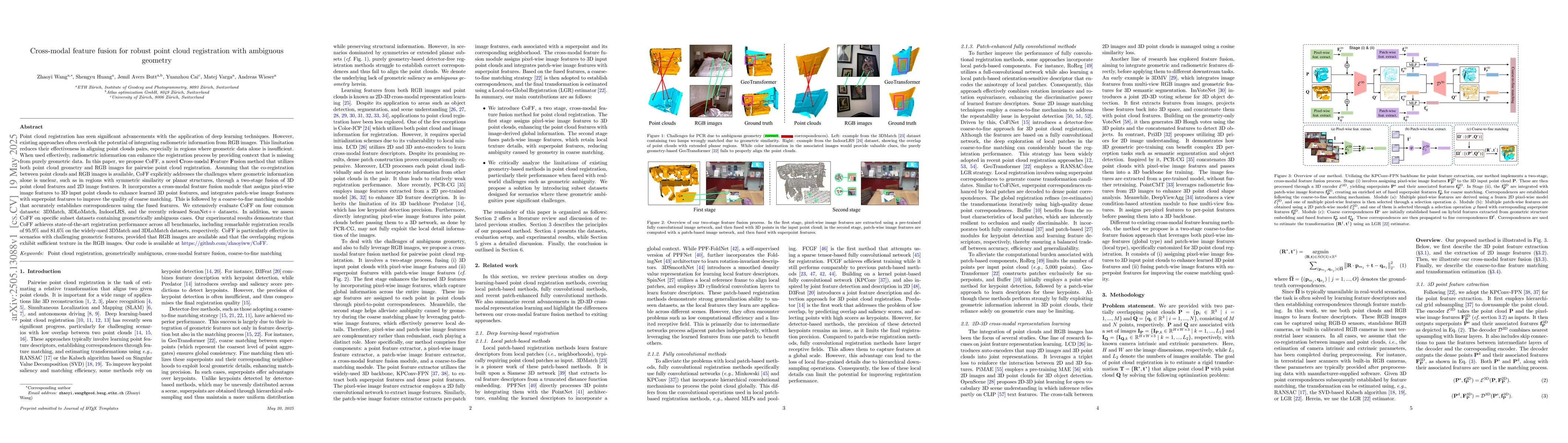 CoFF distinguishes itself by explicitly addressing ambiguous geometric regions using pixel-wise image features and superpoint features, enhancing learned 3D point features.