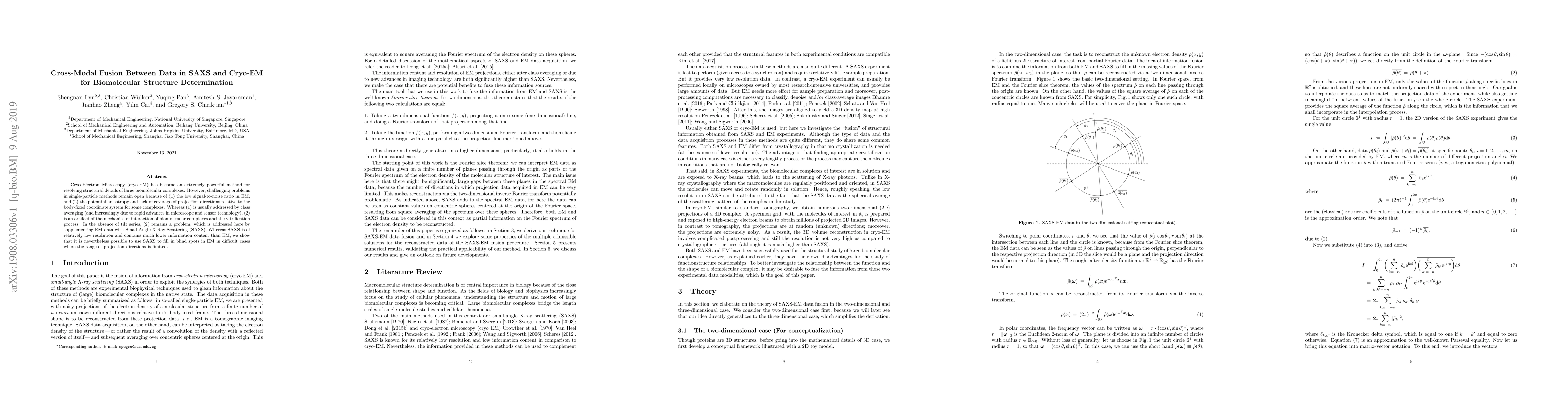 Cryo-Electron Microscopy (cryo-EM) has become an extremely powerful method for resolving structural details of large biomolecular complexes. However, challenging problems in single-particle methods remain open because of (1) the low signal-to-noise ratio in EM; and (2) the potential anisotropy and lack of coverage of projection directions relative to the body-fixed coordinate system for some complexes. Whereas (1) is usually addressed by class averaging (and increasingly due to rapid advances in microscope and sensor technology), (2) is an artifact of the mechanics of interaction of biomolecular complexes and the vitrification process. In the absence of tilt series, (2) remains a problem, which is addressed here by supplementing EM data with Small-Angle X-Ray Scattering (SAXS). Whereas SAXS is of relatively low resolution and contains much lower information content than EM, we show that it is nevertheless possible to use SAXS to fill in blind spots in EM in difficult cases where the range of projection directions is limited.