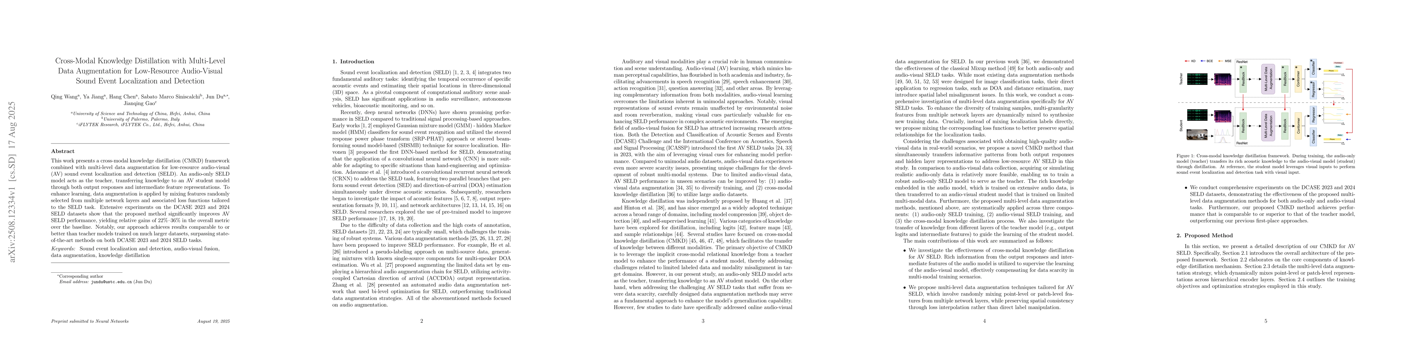 This work presents a cross-modal knowledge distillation (CMKD) framework combined with multi-level data augmentation for low-resource audio-visual (AV) sound event localization and detection (SELD). An audio-only SELD model acts as the teacher, transferring knowledge to an AV student model through both output responses and intermediate feature representations. To enhance learning, data augmentation is applied by mixing features randomly selected from multiple network layers and associated loss functions tailored to the SELD task. Extensive experiments on the DCASE 2023 and 2024 SELD datasets show that the proposed method significantly improves AV SELD performance, yielding relative gains of 22%~36% in the overall metric over the baseline. Notably, our approach achieves results comparable to or better than teacher models trained on much larger datasets, surpassing state-of-the-art methods on both DCASE 2023 and 2024 SELD tasks.