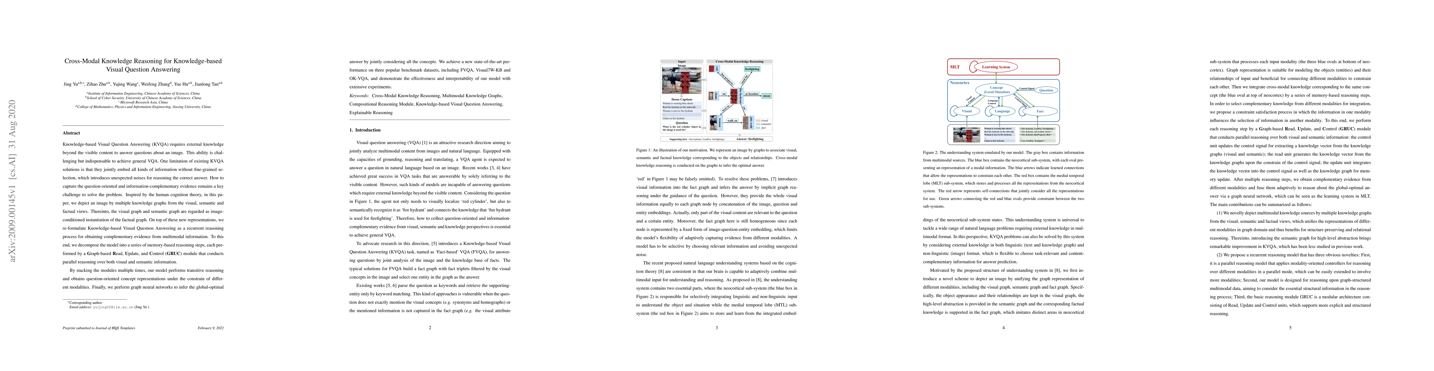 Knowledge-based Visual Question Answering (KVQA) requires external knowledge beyond the visible content to answer questions about an image. This ability is challenging but indispensable to achieve general VQA. One limitation of existing KVQA solutions is that they jointly embed all kinds of information without fine-grained selection, which introduces unexpected noises for reasoning the correct answer. How to capture the question-oriented and information-complementary evidence remains a key challenge to solve the problem. Inspired by the human cognition theory, in this paper, we depict an image by multiple knowledge graphs from the visual, semantic and factual views. Thereinto, the visual graph and semantic graph are regarded as image-conditioned instantiation of the factual graph. On top of these new representations, we re-formulate Knowledge-based Visual Question Answering as a recurrent reasoning process for obtaining complementary evidence from multimodal information. To this end, we decompose the model into a series of memory-based reasoning steps, each performed by a G raph-based R ead, U pdate, and C ontrol ( GRUC ) module that conducts parallel reasoning over both visual and semantic information. By stacking the modules multiple times, our model performs transitive reasoning and obtains question-oriented concept representations under the constrain of different modalities. Finally, we perform graph neural networks to infer the global-optimal answer by jointly considering all the concepts. We achieve a new state-of-the-art performance on three popular benchmark datasets, including FVQA, Visual7W-KB and OK-VQA, and demonstrate the effectiveness and interpretability of our model with extensive experiments.