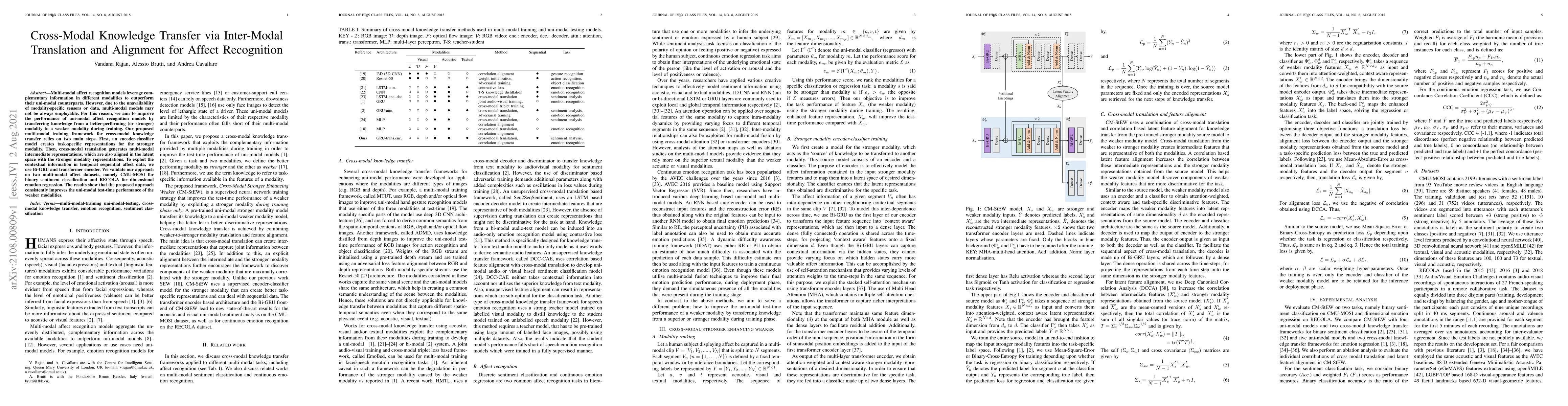 This paper proposes a framework for cross-modal knowledge transfer to enhance uni-modal affect recognition models by leveraging stronger modality representations. The method involves encoding task-specific representations and generating aligned multi-modal intermediate representations, showing consistent improvements in uni-modal performance on two datasets.