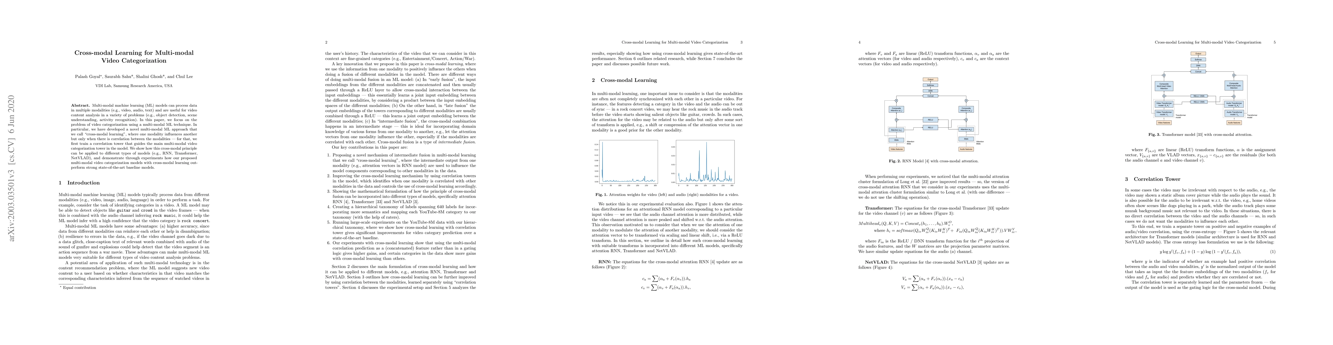 This paper introduces a novel multi-modal learning technique called "cross-modal learning" for video categorization, where one modality influences another based on correlation. The approach employs a correlation tower to guide the main categorization model, and experiments show it outperforms state-of-the-art baselines.
