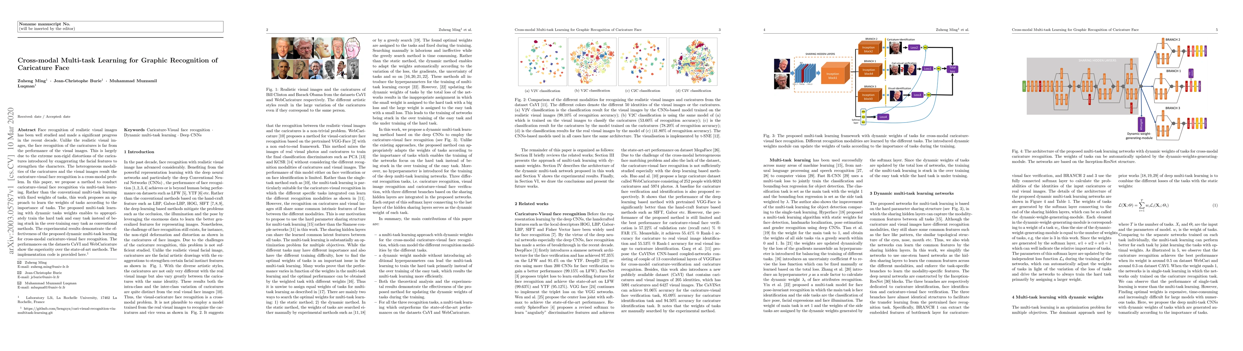 This paper proposes a dynamic multi-task learning method for cross-modal caricature-visual face recognition, addressing the challenge of non-rigid distortions in caricatures. The approach adjusts task weights based on task importance, leading to improved performance over state-of-the-art methods on datasets CaVI and WebCaricature.