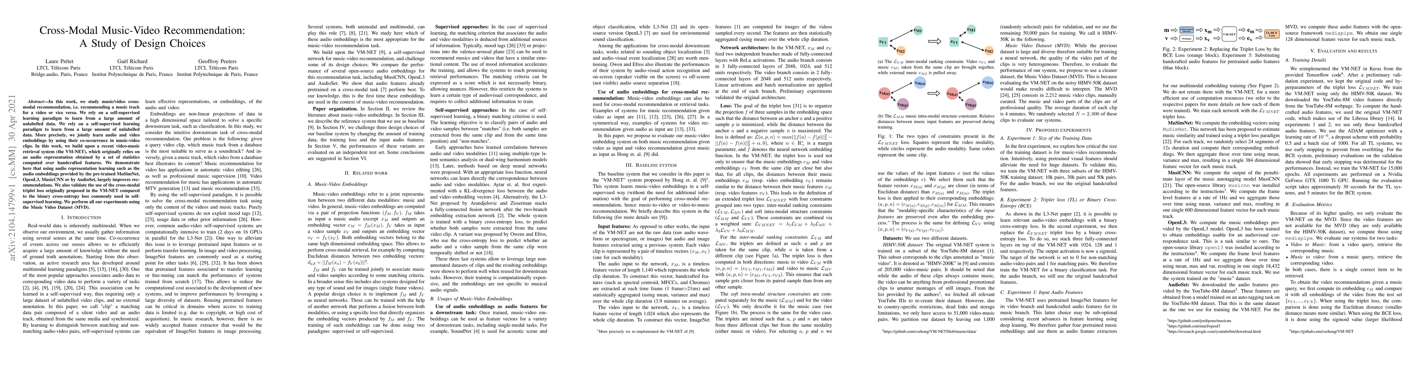 In this work, we study music/video cross-modal recommendation, i.e. recommending a music track for a video or vice versa. We rely on a self-supervised learning paradigm to learn from a large amount of unlabelled data. We rely on a self-supervised learning paradigm to learn from a large amount of unlabelled data. More precisely, we jointly learn audio and video embeddings by using their co-occurrence in music-video clips. In this work, we build upon a recent video-music retrieval system (the VM-NET), which originally relies on an audio representation obtained by a set of statistics computed over handcrafted features. We demonstrate here that using audio representation learning such as the audio embeddings provided by the pre-trained MuSimNet, OpenL3, MusicCNN or by AudioSet, largely improves recommendations. We also validate the use of the cross-modal triplet loss originally proposed in the VM-NET compared to the binary cross-entropy loss commonly used in self-supervised learning. We perform all our experiments using the Music Video Dataset (MVD).