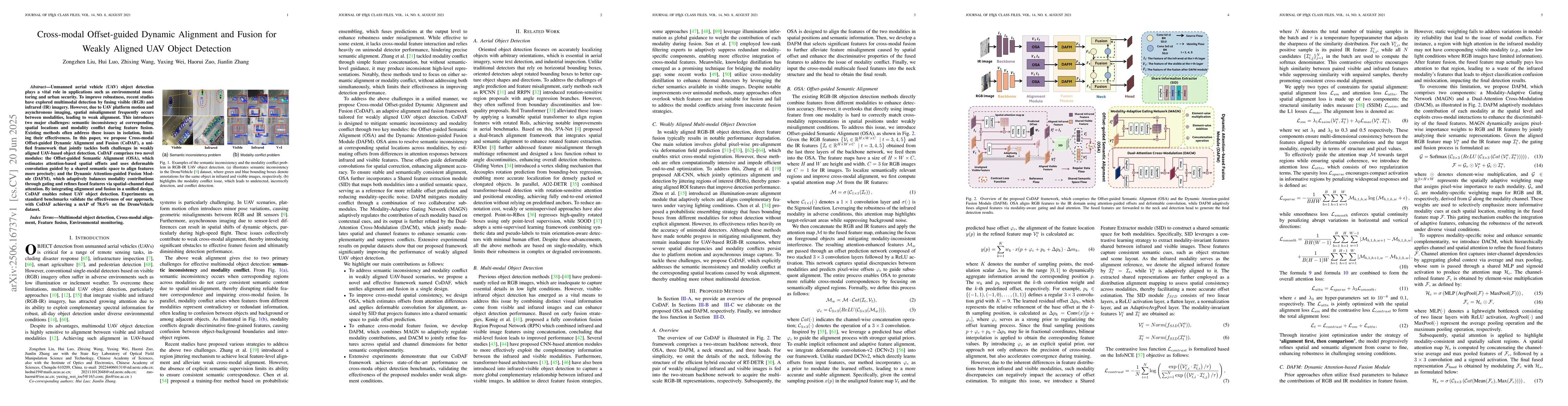 Unmanned aerial vehicle (UAV) object detection plays a vital role in applications such as environmental monitoring and urban security. To improve robustness, recent studies have explored multimodal detection by fusing visible (RGB) and infrared (IR) imagery. However, due to UAV platform motion and asynchronous imaging, spatial misalignment frequently occurs between modalities, leading to weak alignment. This introduces two major challenges: semantic inconsistency at corresponding spatial locations and modality conflict during feature fusion. Existing methods often address these issues in isolation, limiting their effectiveness. In this paper, we propose Cross-modal Offset-guided Dynamic Alignment and Fusion (CoDAF), a unified framework that jointly tackles both challenges in weakly aligned UAV-based object detection. CoDAF comprises two novel modules: the Offset-guided Semantic Alignment (OSA), which estimates attention-based spatial offsets and uses deformable convolution guided by a shared semantic space to align features more precisely; and the Dynamic Attention-guided Fusion Module (DAFM), which adaptively balances modality contributions through gating and refines fused features via spatial-channel dual attention. By integrating alignment and fusion in a unified design, CoDAF enables robust UAV object detection. Experiments on standard benchmarks validate the effectiveness of our approach, with CoDAF achieving a mAP of 78.6% on the DroneVehicle dataset.
