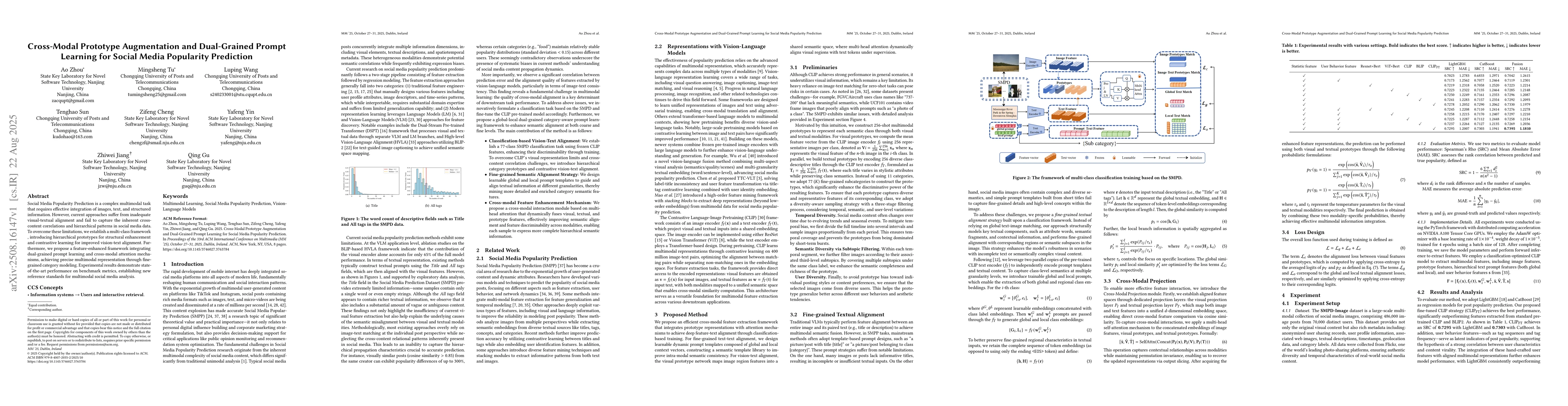 Social Media Popularity Prediction is a complex multimodal task that requires effective integration of images, text, and structured information. However, current approaches suffer from inadequate visual-textual alignment and fail to capture the inherent cross-content correlations and hierarchical patterns in social media data. To overcome these limitations, we establish a multi-class framework , introducing hierarchical prototypes for structural enhancement and contrastive learning for improved vision-text alignment. Furthermore, we propose a feature-enhanced framework integrating dual-grained prompt learning and cross-modal attention mechanisms, achieving precise multimodal representation through fine-grained category modeling. Experimental results demonstrate state-of-the-art performance on benchmark metrics, establishing new reference standards for multimodal social media analysis.