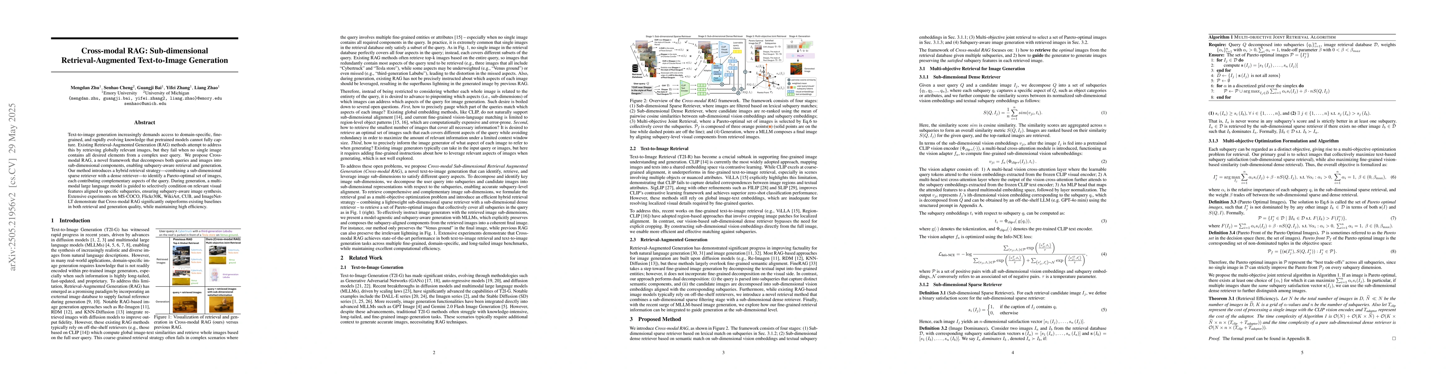Text-to-image generation increasingly demands access to domain-specific, fine-grained, and rapidly evolving knowledge that pretrained models cannot fully capture. Existing Retrieval-Augmented Generation (RAG) methods attempt to address this by retrieving globally relevant images, but they fail when no single image contains all desired elements from a complex user query. We propose Cross-modal RAG, a novel framework that decomposes both queries and images into sub-dimensional components, enabling subquery-aware retrieval and generation. Our method introduces a hybrid retrieval strategy - combining a sub-dimensional sparse retriever with a dense retriever - to identify a Pareto-optimal set of images, each contributing complementary aspects of the query. During generation, a multimodal large language model is guided to selectively condition on relevant visual features aligned to specific subqueries, ensuring subquery-aware image synthesis. Extensive experiments on MS-COCO, Flickr30K, WikiArt, CUB, and ImageNet-LT demonstrate that Cross-modal RAG significantly outperforms existing baselines in both retrieval and generation quality, while maintaining high efficiency.