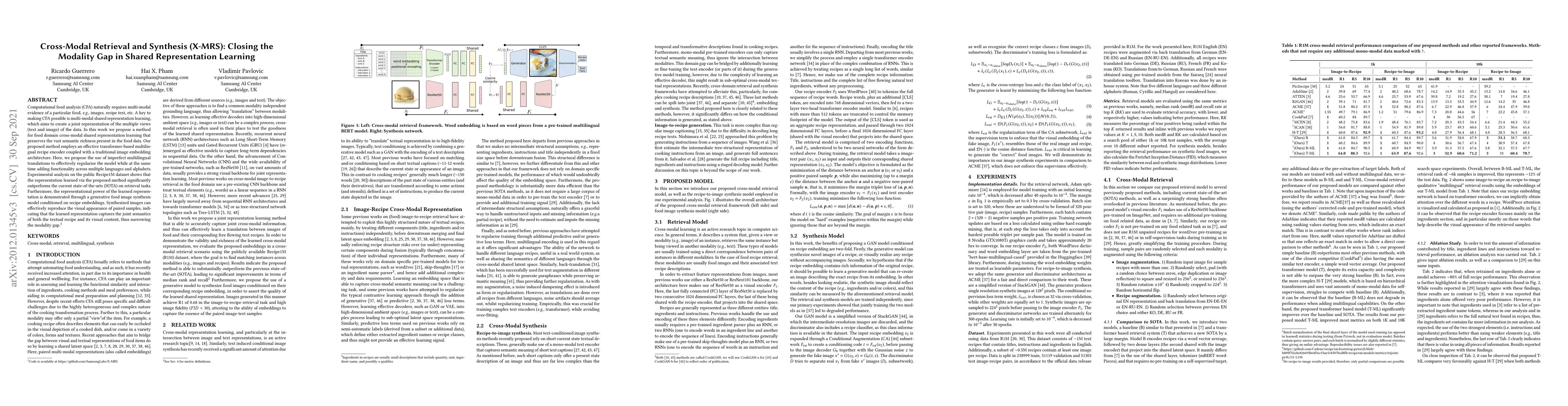 A new method for cross-modal shared representation learning in food analysis outperforms current state-of-the-art methods on retrieval tasks and generates realistic images conditioned on recipe embeddings.