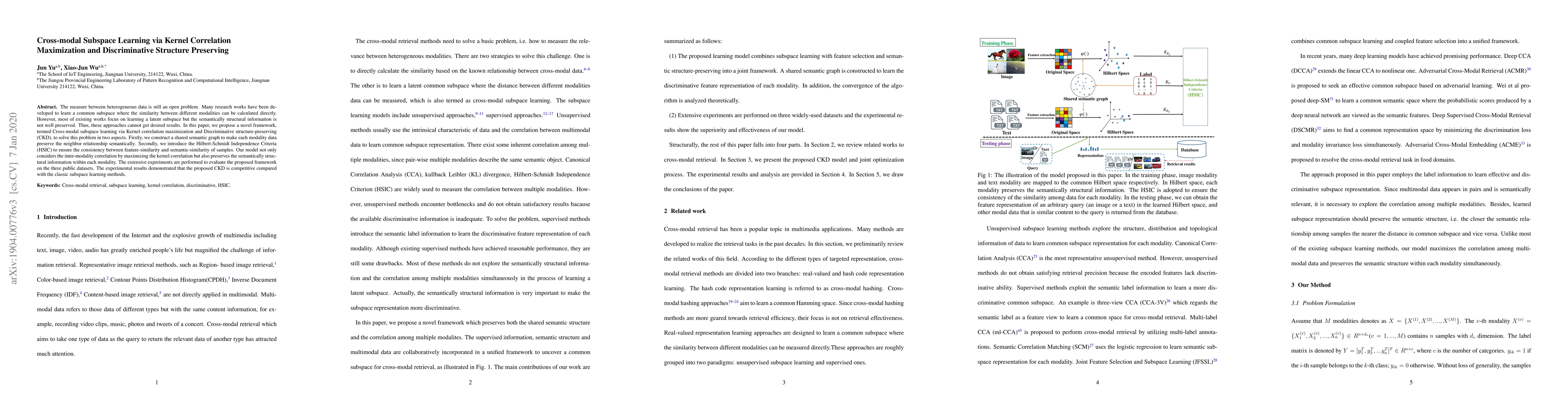 A new framework called Cross-modal subspace learning via Kernel correlation maximization and Discriminative structure-preserving (CKD) is proposed to preserve semantic structural information in heterogeneous data.