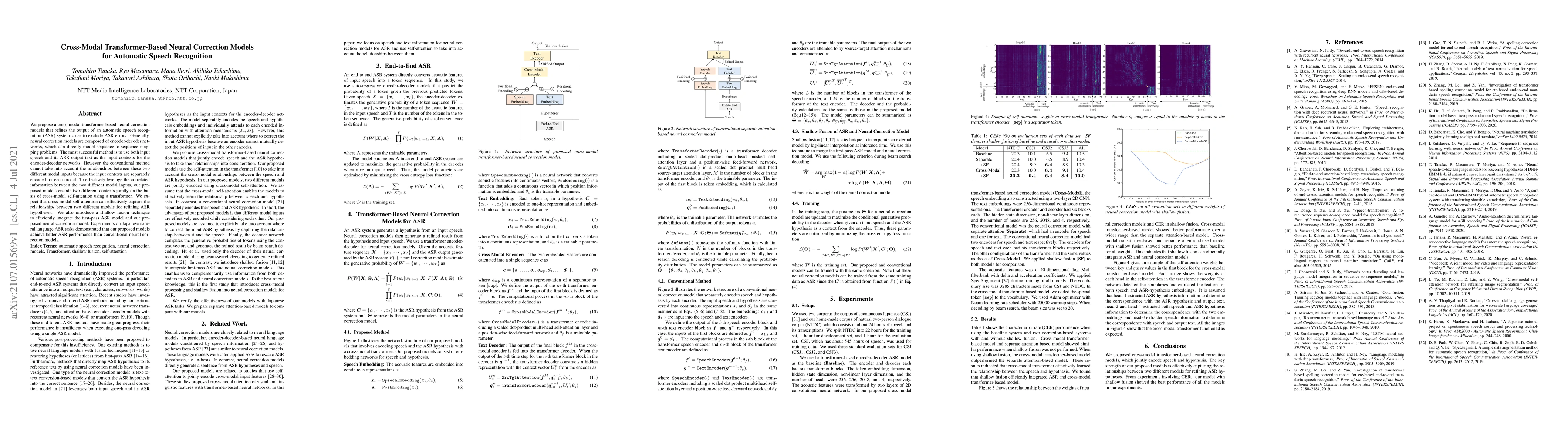 This paper proposes a cross-modal transformer-based neural correction model that refines automatic speech recognition (ASR) outputs by encoding speech and ASR text jointly using cross-modal self-attention. This approach, combined with a shallow fusion technique, outperforms conventional methods in Japanese ASR tasks.
