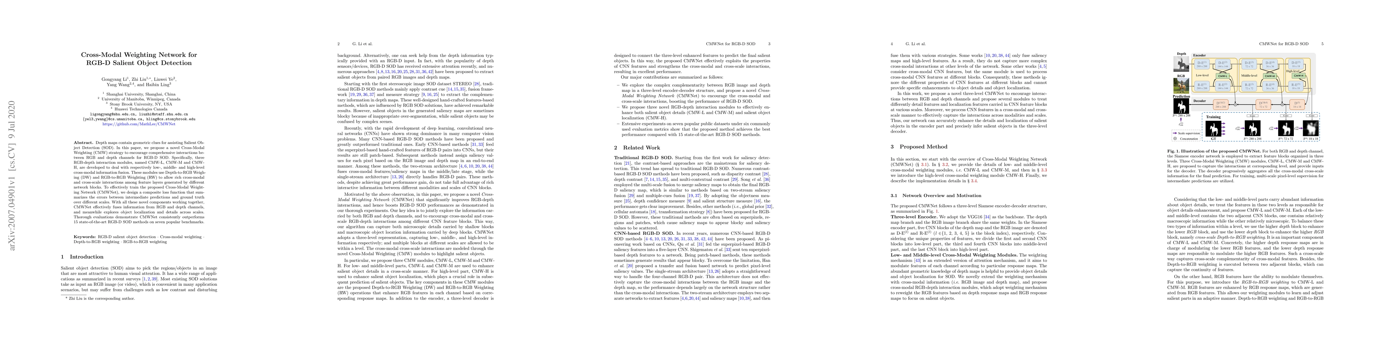 This paper proposes a Cross-Modal Weighting Network (CMWNet) for RGB-D salient object detection, utilizing three interaction modules to fuse RGB and depth information at different levels. The network employs a composite loss function to train effectively, achieving superior performance compared to 15 state-of-the-art methods on seven benchmarks.