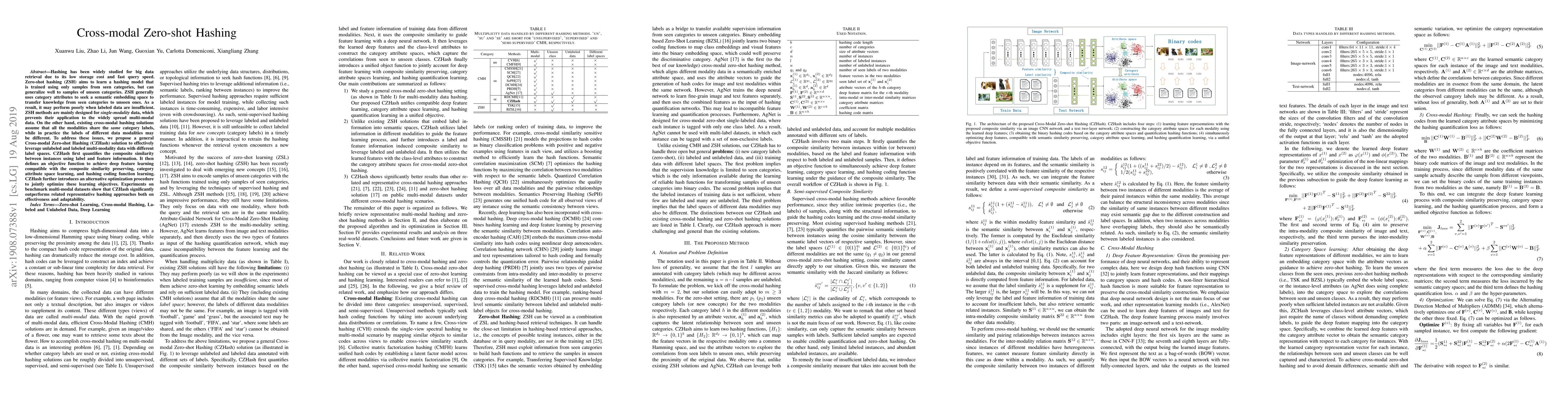 Hashing has been widely studied for big data retrieval due to its low storage cost and fast query speed. Zero-shot hashing (ZSH) aims to learn a hashing model that is trained using only samples from seen categories, but can generalize well to samples of unseen categories. ZSH generally uses category attributes to seek a semantic embedding space to transfer knowledge from seen categories to unseen ones. As a result, it may perform poorly when labeled data are insufficient. ZSH methods are mainly designed for single-modality data, which prevents their application to the widely spread multi-modal data. On the other hand, existing cross-modal hashing solutions assume that all the modalities share the same category labels, while in practice the labels of different data modalities may be different. To address these issues, we propose a general Cross-modal Zero-shot Hashing (CZHash) solution to effectively leverage unlabeled and labeled multi-modality data with different label spaces. CZHash first quantifies the composite similarity between instances using label and feature information. It then defines an objective function to achieve deep feature learning compatible with the composite similarity preserving, category attribute space learning, and hashing coding function learning. CZHash further introduces an alternative optimization procedure to jointly optimize these learning objectives. Experiments on benchmark multi-modal datasets show that CZHash significantly outperforms related representative hashing approaches both on effectiveness and adaptability.