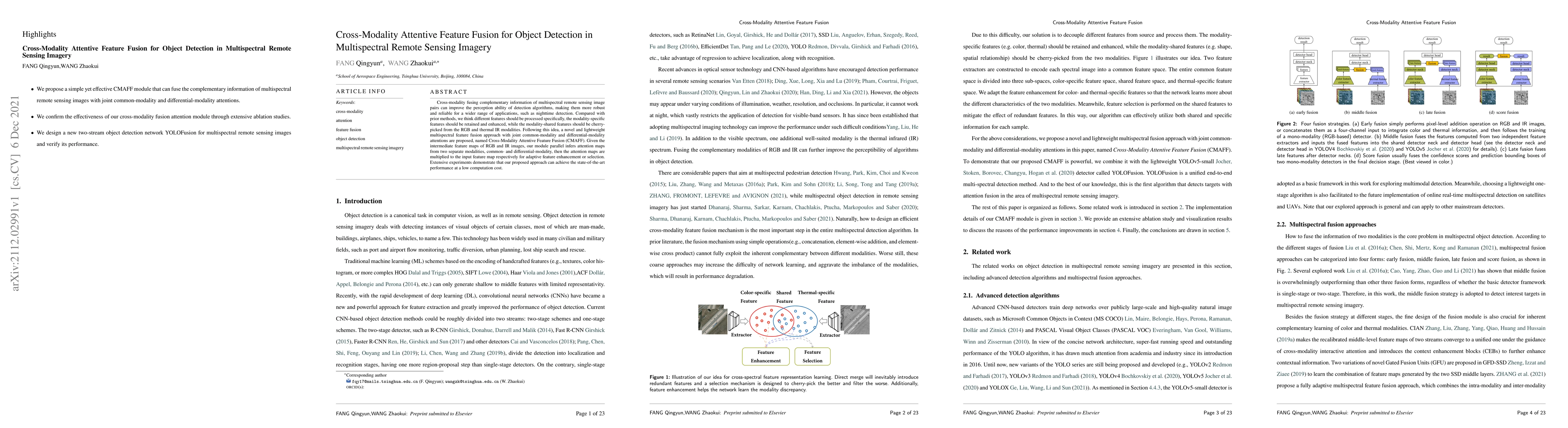 The paper proposes a novel Cross-Modality Attentive Feature Fusion (CMAFF) method to enhance object detection in multispectral remote sensing imagery by fusing complementary information from RGB and thermal IR modalities. The approach selectively retains and enhances modality-specific features while cherry-picking shared features, achieving state-of-the-art performance with low computational cost.