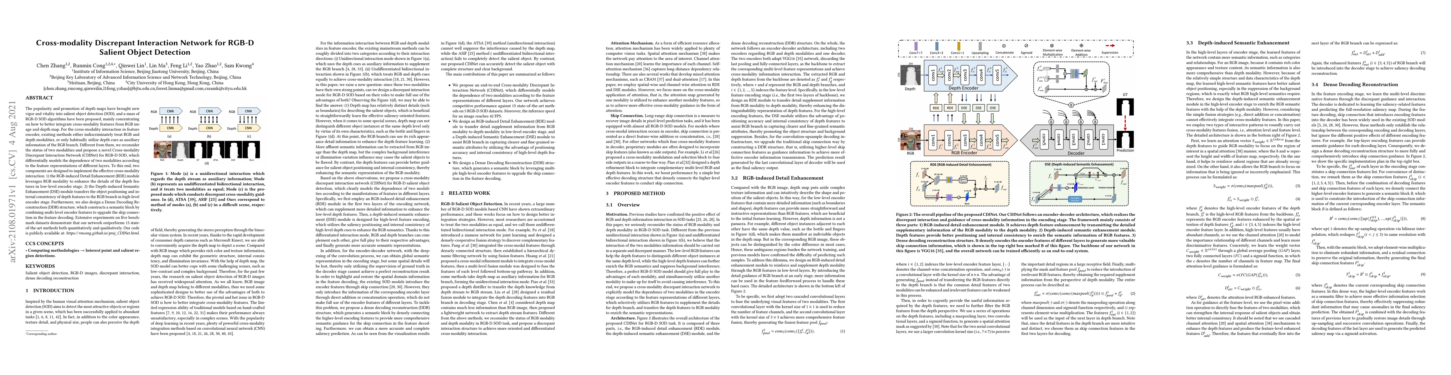 The paper proposes a Cross-modality Discrepant Interaction Network (CDINet) for RGB-D salient object detection, which differentially models the interaction between RGB and depth features. The network includes an RGB-induced Detail Enhancement module and a Depth-induced Semantic Enhancement module to enhance feature representations, followed by a Dense Decoding Reconstruction structure for improved decoding. Experiments show superior performance over 15 state-of-the-art methods.