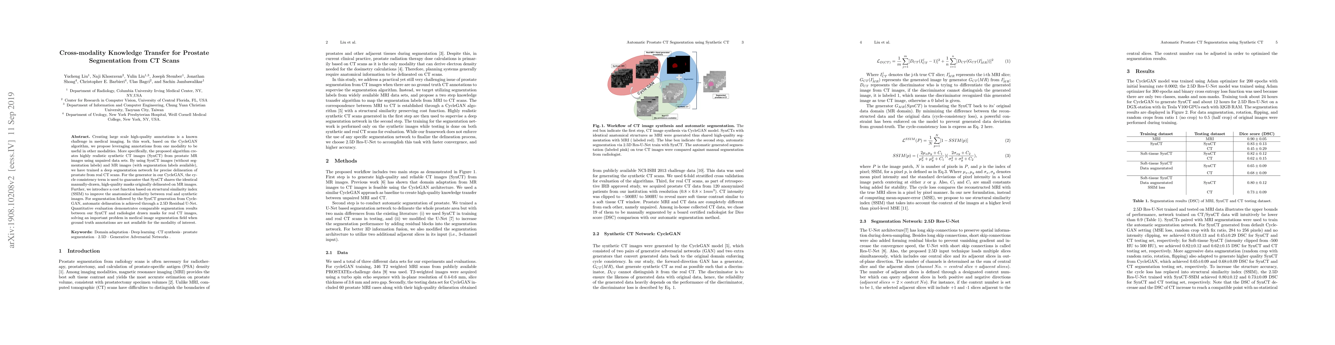 This paper proposes a CycleGAN-based method to transfer annotations from MR to CT scans for prostate segmentation, generating synthetic CT images from MR images. The approach uses cycle consistency and structural similarity to ensure anatomical accuracy, achieving precise segmentation of prostates in CT scans without direct annotations.