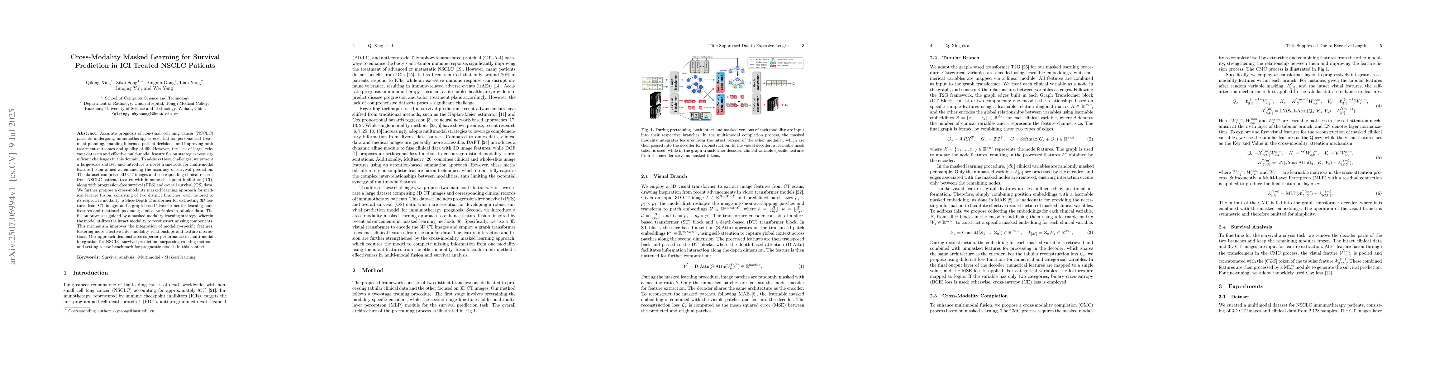 Accurate prognosis of non-small cell lung cancer (NSCLC) patients undergoing immunotherapy is essential for personalized treatment planning, enabling informed patient decisions, and improving both treatment outcomes and quality of life. However, the lack of large, relevant datasets and effective multi-modal feature fusion strategies pose significant challenges in this domain. To address these challenges, we present a large-scale dataset and introduce a novel framework for multi-modal feature fusion aimed at enhancing the accuracy of survival prediction. The dataset comprises 3D CT images and corresponding clinical records from NSCLC patients treated with immune checkpoint inhibitors (ICI), along with progression-free survival (PFS) and overall survival (OS) data. We further propose a cross-modality masked learning approach for medical feature fusion, consisting of two distinct branches, each tailored to its respective modality: a Slice-Depth Transformer for extracting 3D features from CT images and a graph-based Transformer for learning node features and relationships among clinical variables in tabular data. The fusion process is guided by a masked modality learning strategy, wherein the model utilizes the intact modality to reconstruct missing components. This mechanism improves the integration of modality-specific features, fostering more effective inter-modality relationships and feature interactions. Our approach demonstrates superior performance in multi-modal integration for NSCLC survival prediction, surpassing existing methods and setting a new benchmark for prognostic models in this context.