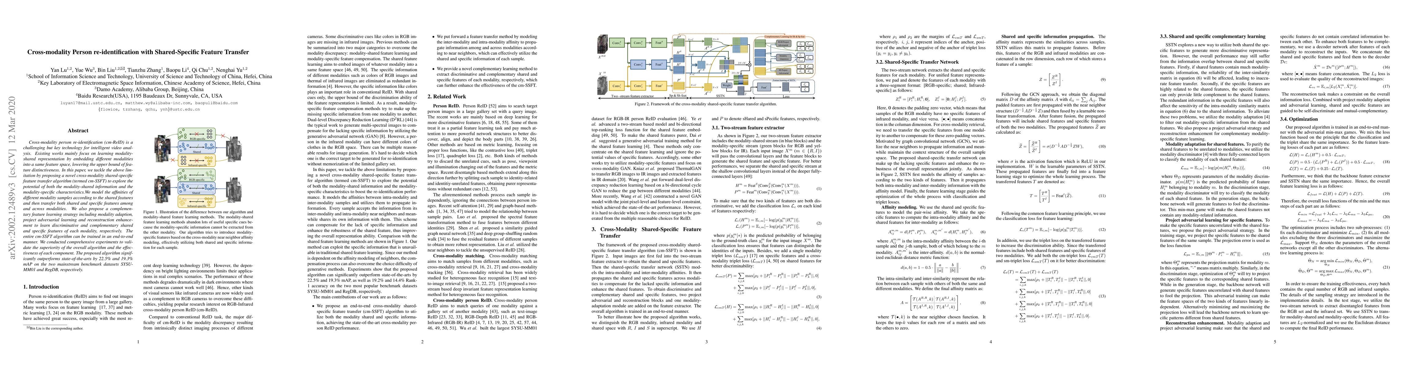 This paper proposes a novel cross-modality shared-specific feature transfer algorithm (cm-SSFT) to enhance person re-identification performance by leveraging both shared and specific features across modalities. The algorithm includes complementary feature learning strategies to achieve discriminative and complementary features, significantly outperforming state-of-the-art methods on SYSU-MM01 and RegDB datasets.