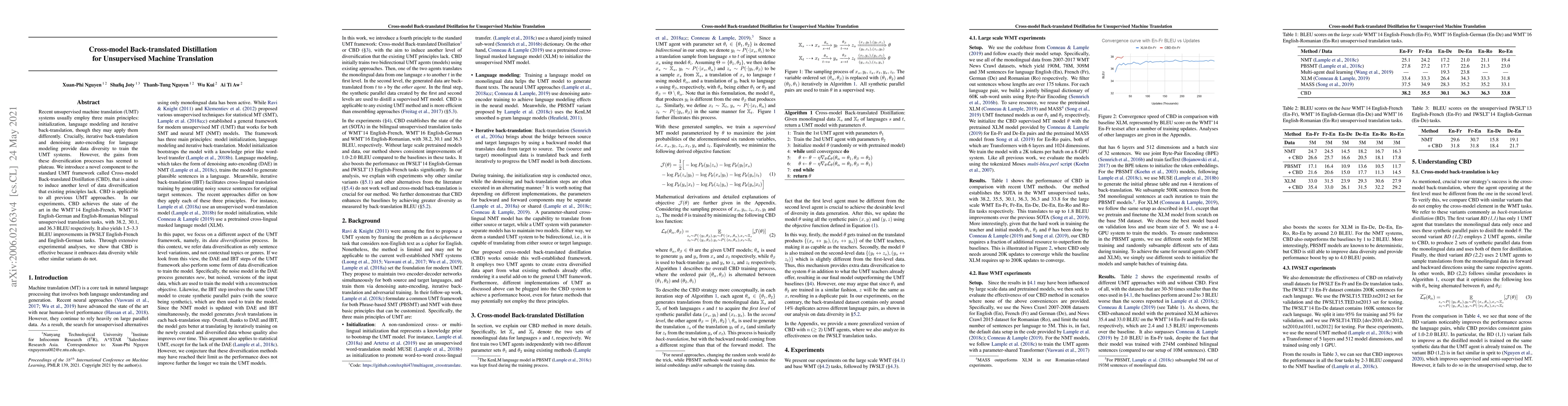 CBD introduces a novel component to the standard UMT framework that induces an additional level of data diversification through cross-model back-translation, improving translation performance.