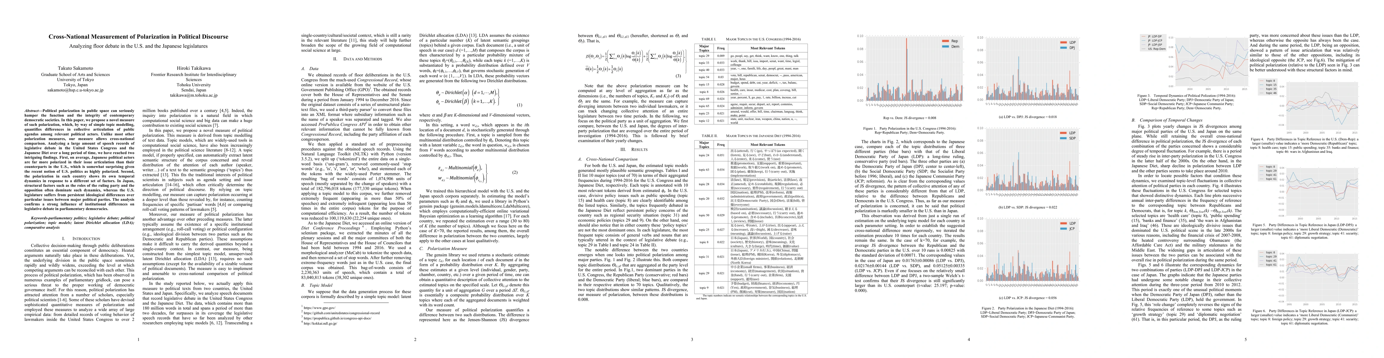 Political polarization in public space can seriously hamper the function and the integrity of contemporary democratic societies. In this paper, we propose a novel measure of such polarization, which, by way of simple topic modelling, quantifies differences in collective articulation of public agendas among relevant political actors. Unlike most other polarization measures, our measure allows cross-national comparison. Analyzing a large amount of speech records of legislative debate in the United States Congress and the Japanese Diet over a long period of time, we have reached two intriguing findings. First, on average, Japanese political actors are far more polarized in their issue articulation than their counterparts in the U.S., which is somewhat surprising given the recent notion of U.S. politics as highly polarized. Second, the polarization in each country shows its own temporal dynamics in response to a different set of factors. In Japan, structural factors such as the roles of the ruling party and the opposition often dominate such dynamics, whereas the U.S. legislature suffers from persistent ideological differences over particular issues between major political parties. The analysis confirms a strong influence of institutional differences on legislative debate in parliamentary democracies.