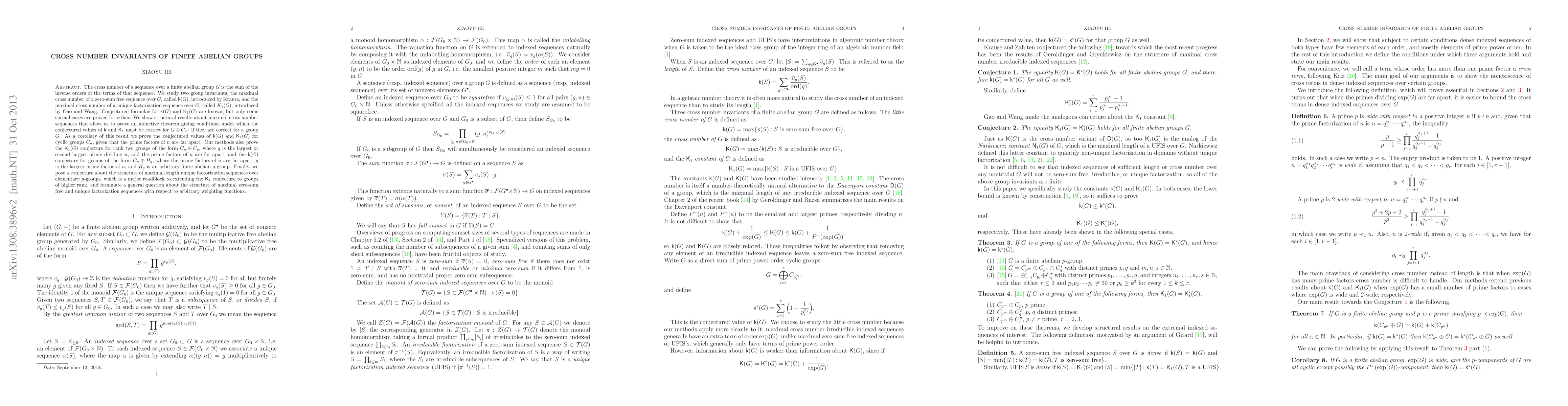 The cross number of a sequence over a finite abelian group $G$ is the sum of the inverse orders of the terms of that sequence. We study two group invariants, the maximal cross number of a zero-sum free sequence over $G$, called $\mathsf{k}(G)$, introduced by Krause, and the maximal cross number of a unique factorization sequence over $G$, called $K_{1}(G)$, introduced by Gao and Wang. Conjectured formulae for $\mathsf{k}(G)$ and $\mathsf{K}_{1}(G)$ are known, but only some special cases are proved for either. We show structural results about maximal cross number sequences that allow us to prove an inductive theorem giving conditions under which the conjectured values of $\mathsf{k}$ and $\mathsf{K}_{1}$ must be correct for $G\oplus C_{p^{\alpha}}$ if they are correct for a group $G$. As a corollary of this result we prove the conjectured values of $\mathsf{k}(G)$ and $\mathsf{K}_{1}(G)$ for cyclic groups $C_{n}$, given that the prime factors of $n$ are far apart. Our methods also prove the $\mathsf{K}_{1}(G)$ conjecture for rank two groups of the form $C_{n}\oplus C_{q}$, where $q$ is the largest or second largest prime dividing $n$, and the prime factors of $n$ are far apart, and the $\mathsf{k}(G)$ conjecture for groups of the form $C_{n}\oplus H_{q}$, where the prime factors of $n$ are far apart, $q$ is the largest prime factor of $n$, and $H_{q}$ is an arbitrary finite abelian $q$-group. Finally, we pose a conjecture about the structure of maximal-length unique factorization sequences over elementary $p$-groups, which is a major roadblock to extending the $\mathsf{K}_{1}$ conjecture to groups of higher rank, and formulate a general question about the structure of maximal zero-sum free and unique factorization sequences with respect to arbitrary weighting functions.