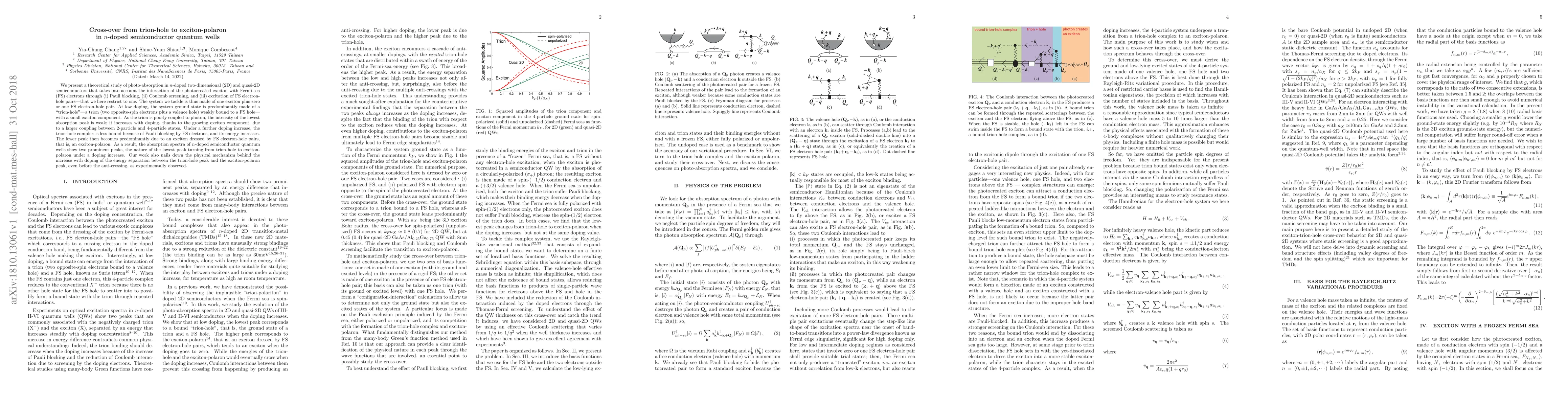 We present a theoretical study of photo-absorption in n-doped two-dimensional (2D) and quasi-2D semiconductors that takes into account the interaction of the photocreated exciton with Fermi-sea (FS) electrons through (i) Pauli blocking, (ii) Coulomb screening, and (iii) excitation of FS electron-hole pairs---that we here restrict to one. The system we tackle is thus made of one exciton plus zero or one FS electron-hole pair. At low doping, the system ground state is predominantly made of a "trion-hole"---a trion (two opposite-spin electrons plus a valence hole) weakly bound to a FS hole---with a small exciton component. As the trion is poorly coupled to photon, the intensity of the lowest absorption peak is weak; it increases with doping, thanks to the growing exciton component, due to a larger coupling between 2-particle and 4-particle states. Under a further doping increase, the trion-hole complex is less bound because of Pauli blocking by FS electrons, and its energy increases. The lower peak then becomes predominantly due to an exciton dressed by FS electron-hole pairs, that is, an exciton-polaron. As a result, the absorption spectra of $n$-doped semiconductor quantum wells show two prominent peaks, the nature of the lowest peak turning from trion-hole to exciton-polaron under a doping increase. Our work also nails down the physical mechanism behind the increase with doping of the energy separation between the trion-hole peak and the exciton-polaron peak, even before the anti-crossing, as experimentally observed.