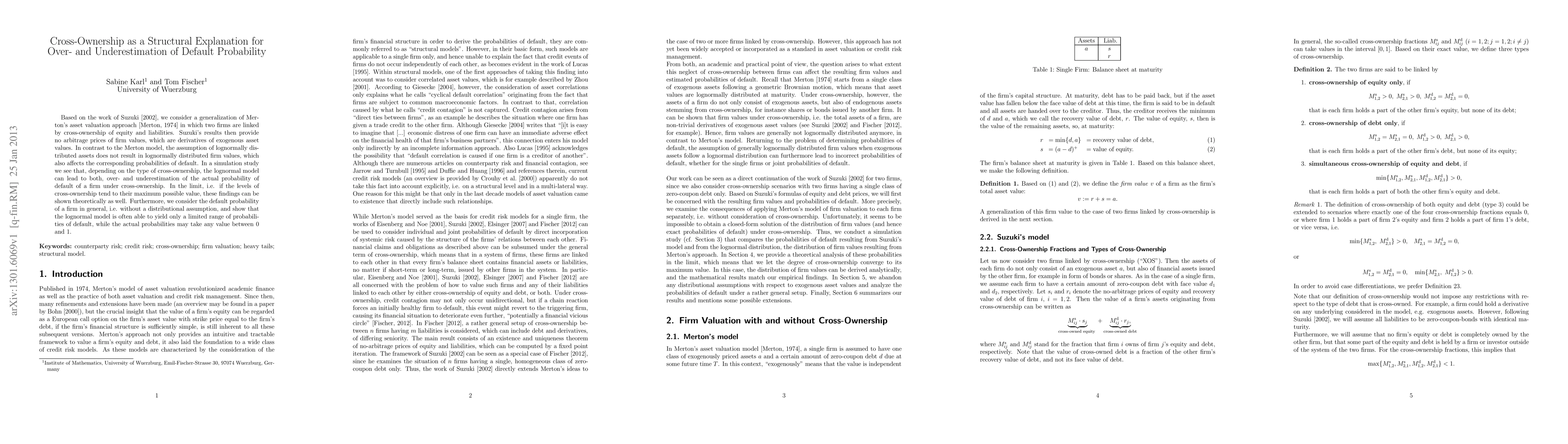 Based on the work of Suzuki (2002), we consider a generalization of Merton's asset valuation approach (Merton, 1974) in which two firms are linked by cross-ownership of equity and liabilities. Suzuki's results then provide no arbitrage prices of firm values, which are derivatives of exogenous asset values. In contrast to the Merton model, the assumption of lognormally distributed assets does not result in lognormally distributed firm values, which also affects the corresponding probabilities of default. In a simulation study we see that, depending on the type of cross-ownership, the lognormal model can lead to both, over- and underestimation of the actual probability of default of a firm under cross-ownership. In the limit, i.e. if the levels of cross-ownership tend to their maximum possible value, these findings can be shown theoretically as well. Furthermore, we consider the default probability of a firm in general, i.e. without a distributional assumption, and show that the lognormal model is often able to yield only a limited range of probabilities of default, while the actual probabilities may take any value between 0 and 1.