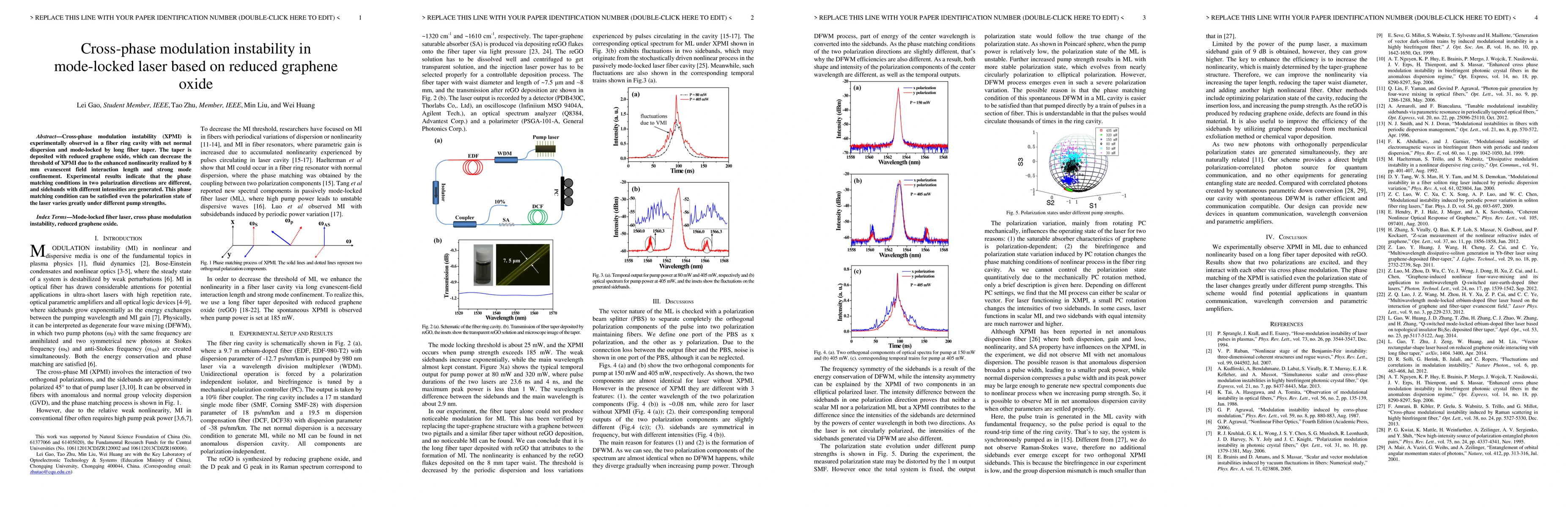 **Summary:** Cross-phase modulation instability is experimentally observed in a mode-locked fiber ring laser enhanced by reduced graphene oxide, which lowers the instability threshold due to increased nonlinearity. Sidebands with varying intensities are generated, demonstrating differing phase matching conditions for two polarization directions.