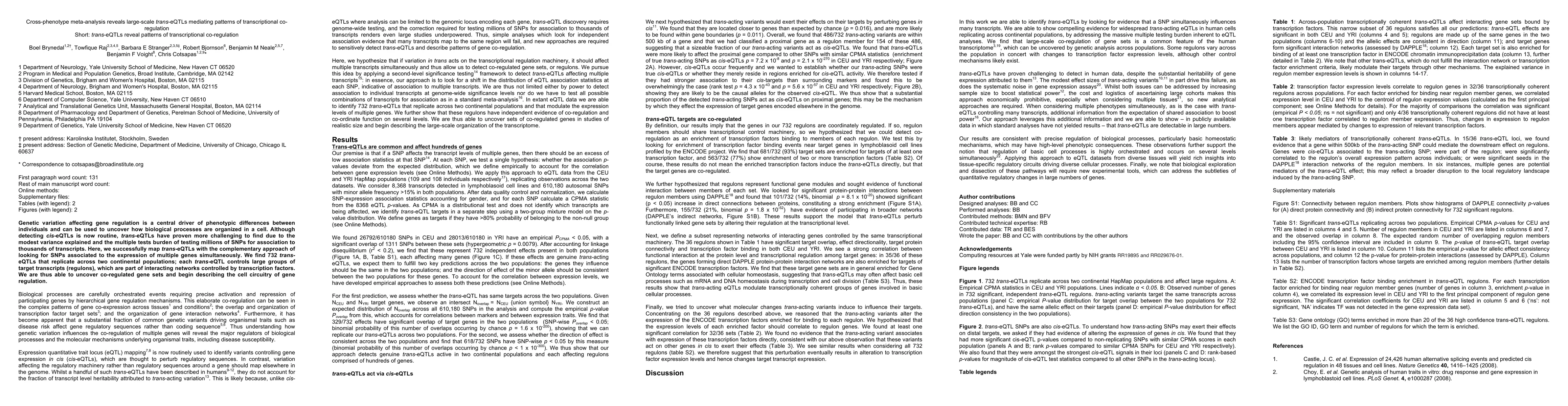 Genetic variation affecting gene regulation is a central driver of phenotypic differences between individuals and can be used to uncover how biological processes are organized in a cell. Although detecting cis-eQTLs is now routine, trans-eQTLs have proven more challenging to find due to the modest variance explained and the multiple tests burden of testing millions of SNPs for association to thousands of transcripts. Here, we successfully map trans-eQTLs with the complementary approach of looking for SNPs associated to the expression of multiple genes simultaneously. We find 732 trans- eQTLs that replicate across two continental populations; each trans-eQTL controls large groups of target transcripts (regulons), which are part of interacting networks controlled by transcription factors. We are thus able to uncover co-regulated gene sets and begin describing the cell circuitry of gene regulation.