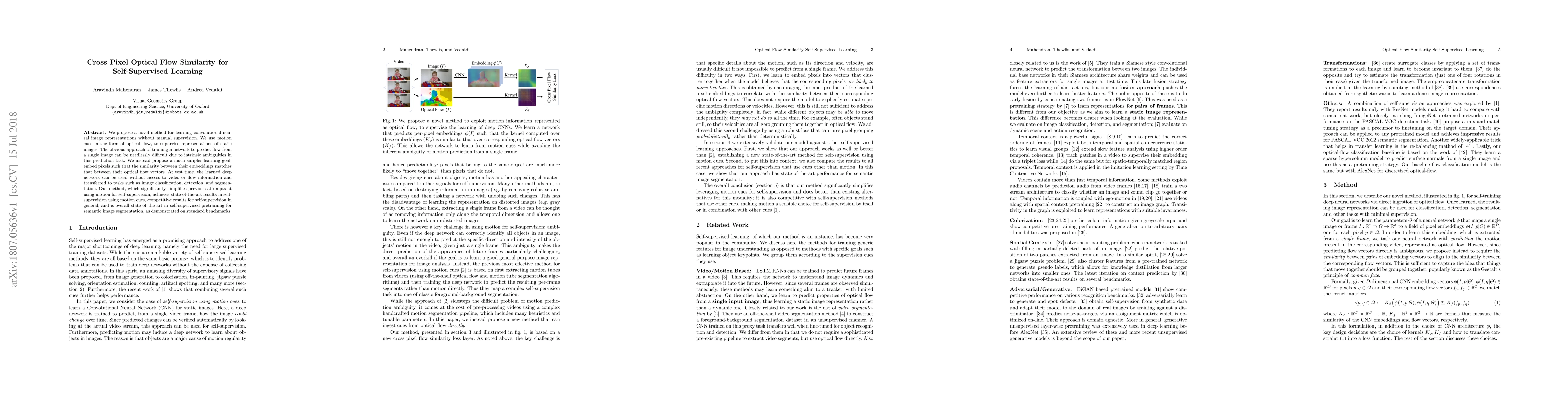 Researchers propose a new method to learn image representations without manual supervision, using optical flow to supervise static images. Their approach achieves state-of-the-art results in self-supervised pretraining for semantic image segmentation.