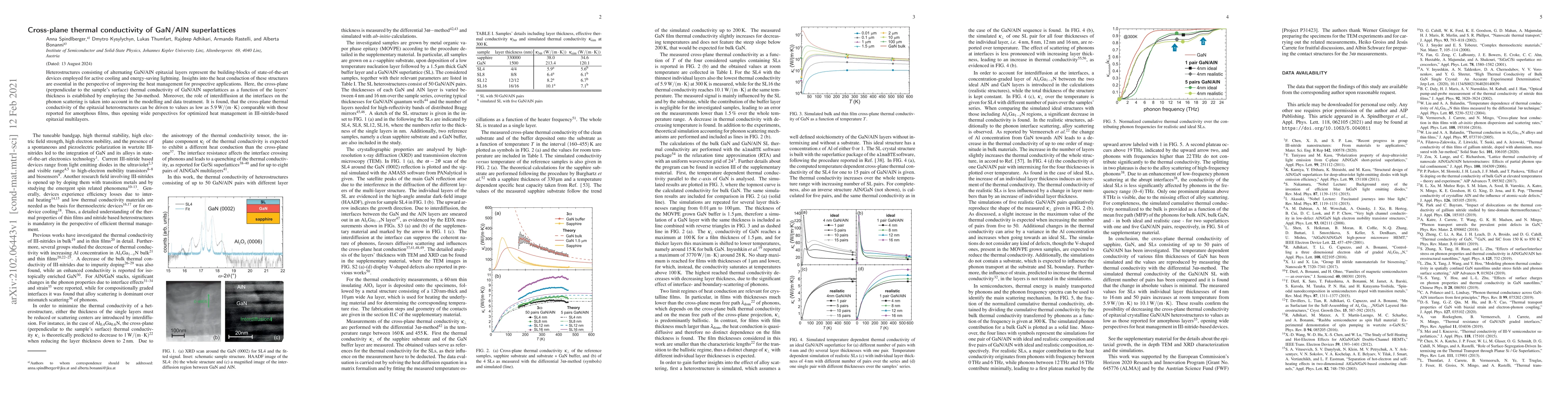 Heterostructures consisting of alternating GaN/AlN epitaxial layers represent the building-blocks of state-of-the-art devices employed for active cooling and energy-saving lightning. Insights into the heat conduction of these structures are essential in the perspective of improving the heat management for prospective applications. Here, the cross-plane (perpendicular to the sample's surface) thermal conductivity of GaN/AlN superlattices as a function of the layers' thickness is established by employing the $3\omega$-method. Moreover, the role of interdiffusion at the interfaces on the phonon scattering is taken into account in the modelling and data treatment. It is found, that the cross-plane thermal conductivity of the epitaxial heterostructures can be driven to values as low as 5.9 W/(m$\cdot$K) comparable with those reported for amorphous films, thus opening wide perspectives for optimized heat management in III-nitride-based epitaxial multilayers.