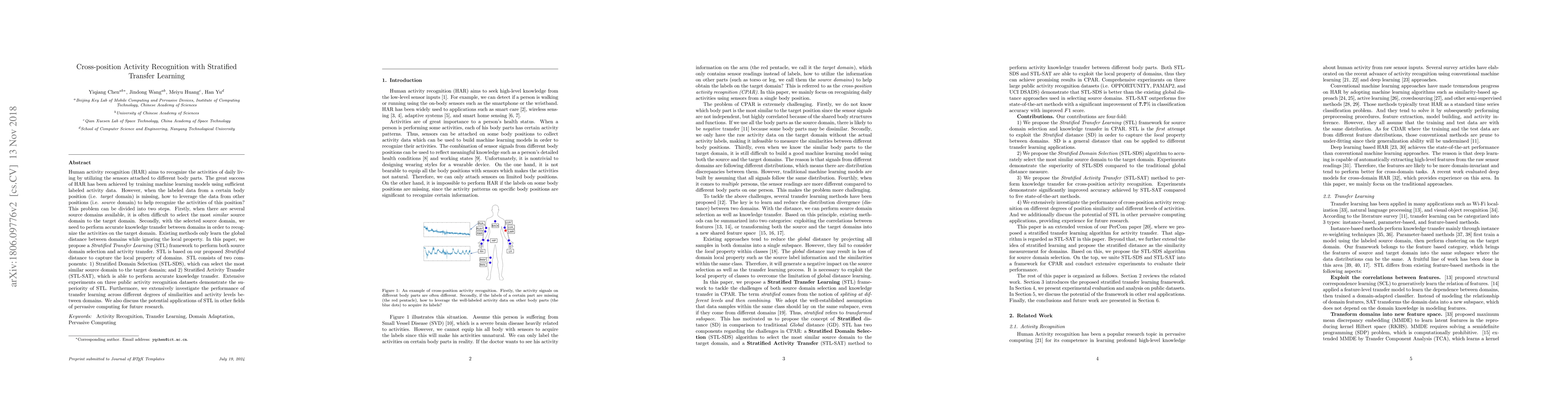 This paper introduces a Stratified Transfer Learning (STL) framework to enhance human activity recognition across different body positions by leveraging data from other positions. STL includes Stratified Domain Selection (STL-SDS) for choosing the most similar source domain and Stratified Activity Transfer (STL-SAT) for precise knowledge transfer, addressing local domain properties. Experiments on public datasets show STL's effectiveness and potential applications in pervasive computing.