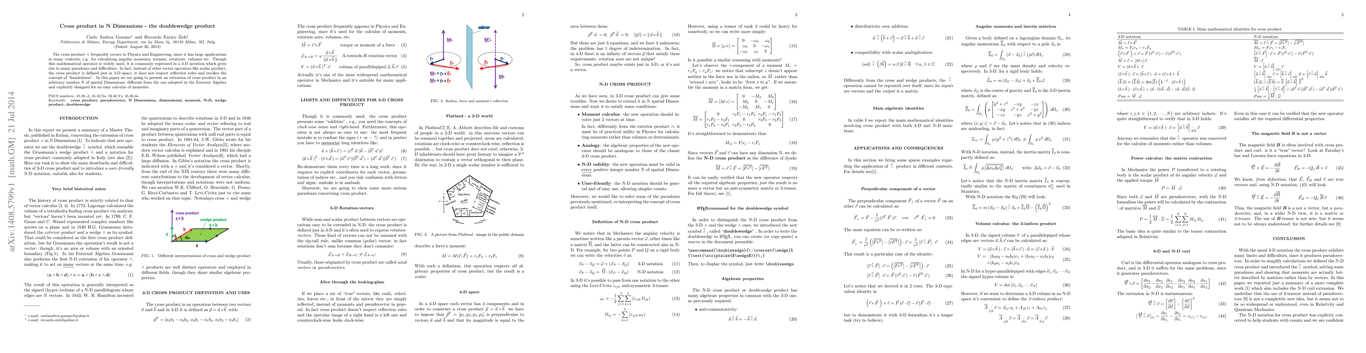 This paper introduces an extension of the cross product to N-dimensional space called the doublewedge product, aiming to resolve the paradoxes and difficulties of the traditional 3-D cross product, and designed for straightforward computation of moments and related quantities in higher dimensions.