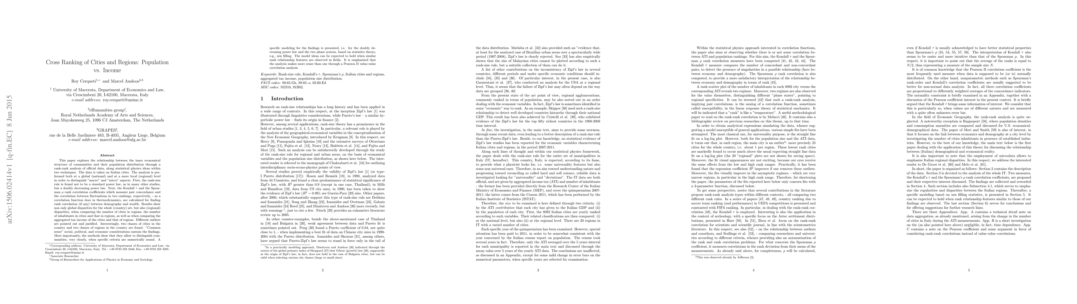 This paper explores the relationship between the inner economical structure of communities and their population distribution through a rank-rank analysis of official data, along statistical physics ideas within two techniques. The data is taken on Italian cities. The analysis is performed both at a global (national) and at a more local (regional) level in order to distinguish "macro" and "micro" aspects. First, the rank-size rule is found not to be a standard power law, as in many other studies, but a doubly decreasing power law. Next, the Kendall and the Spearman rank correlation coefficients which measure pair concordance and the correlation between fluctuations in two rankings, respectively, - as a correlation function does in thermodynamics, are calculated for finding rank correlation (if any) between demography and wealth. Results show non only global disparities for the whole (country) set, but also (regional) disparities, when comparing the number of cities in regions, the number of inhabitants in cities and that in regions, as well as when comparing the aggregated tax income of the cities and that of regions. Different outliers are pointed out and justified. Interestingly, two classes of cities in the country and two classes of regions in the country are found. "Common sense" social, political, and economic considerations sustain the findings. More importantly, the methods show that they allow to distinguish communities, very clearly, when specific criteria are numerically sound. A specific modeling for the findings is presented, i.e. for the doubly decreasing power law and the two phase system, based on statistics theory, e.g., urn filling. The model ideas can be expected to hold when similar rank relationship features are observed in fields. It is emphasized that the analysis makes more sense than one through a Pearson value-value correlation analysis.
