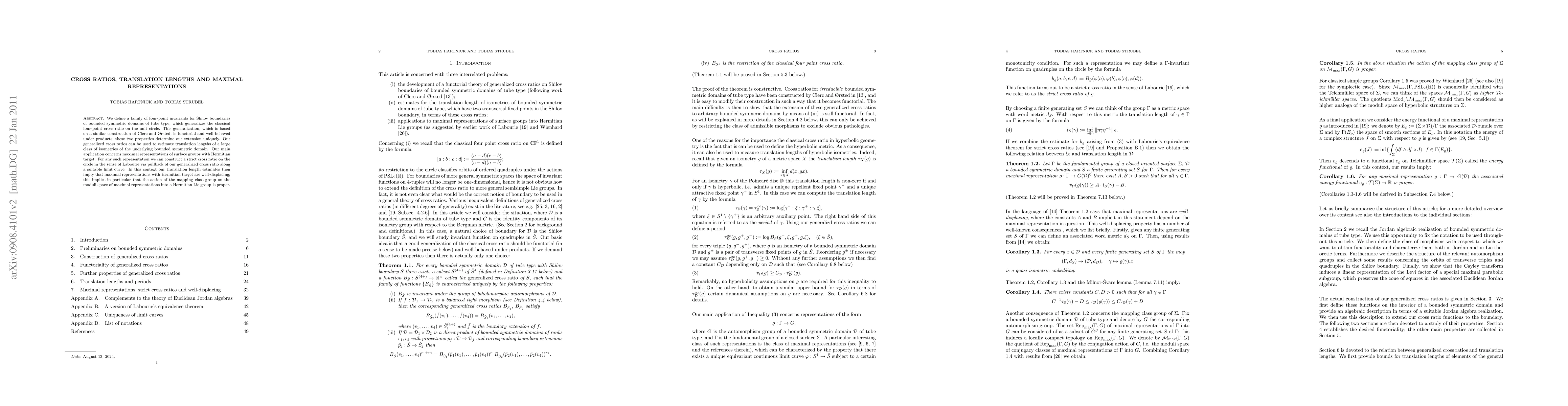 We define a family of four-point invariants for Shilov boundaries of bounded symmetric domains of tube type, which generalizes the classical four-point cross ratio on the unit circle. This generalization, which is based on a similar construction of Clerc and {\O}rsted, is functorial and well-behaved under products; these two properties determine our extension uniquely. Our generalized cross ratios can be used to estimate translation lengths of a large class of isometries of the underlying bounded symmetric domain. Our main application concerns maximal representations of surface groups with Hermitian target. For any such representation we can construct a strict cross ratio on the circle in the sense of Labourie via pullback of our generalized cross ratio along a suitable limit curve. In this context our translation length estimates then imply that maximal representations with Hermitian target are well-displacing; this implies in particular that the action of the mapping class group on the moduli space of maximal representations into a Hermitian Lie group is proper.