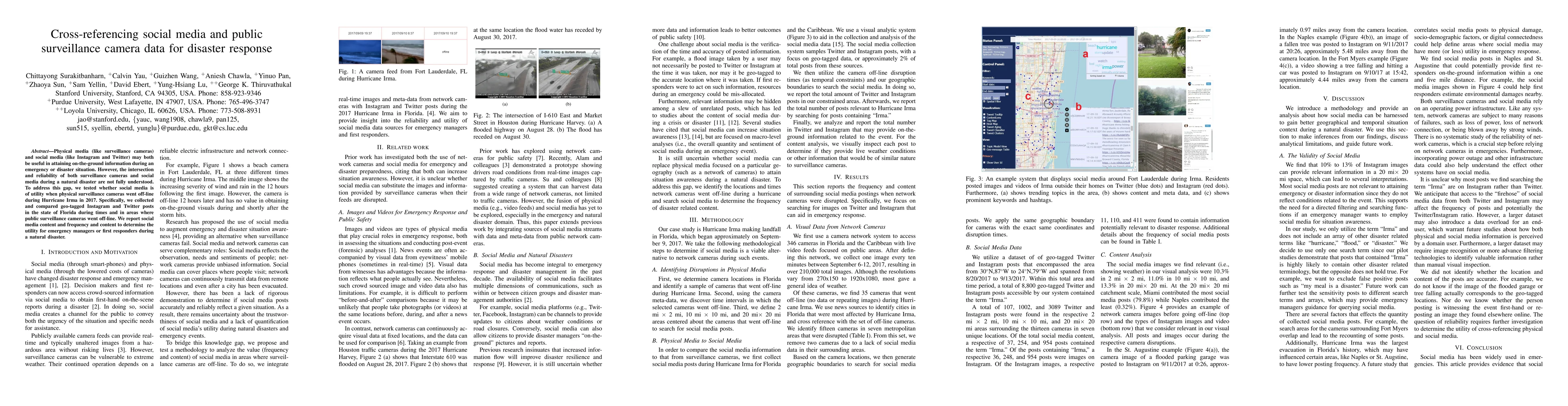 This study examines the utility of social media data, specifically Instagram and Twitter posts, during natural disasters when public surveillance cameras are offline. The research focuses on the 2017 Hurricane Irma, comparing social media content with areas where surveillance cameras failed, to assess their reliability and usefulness for emergency response.