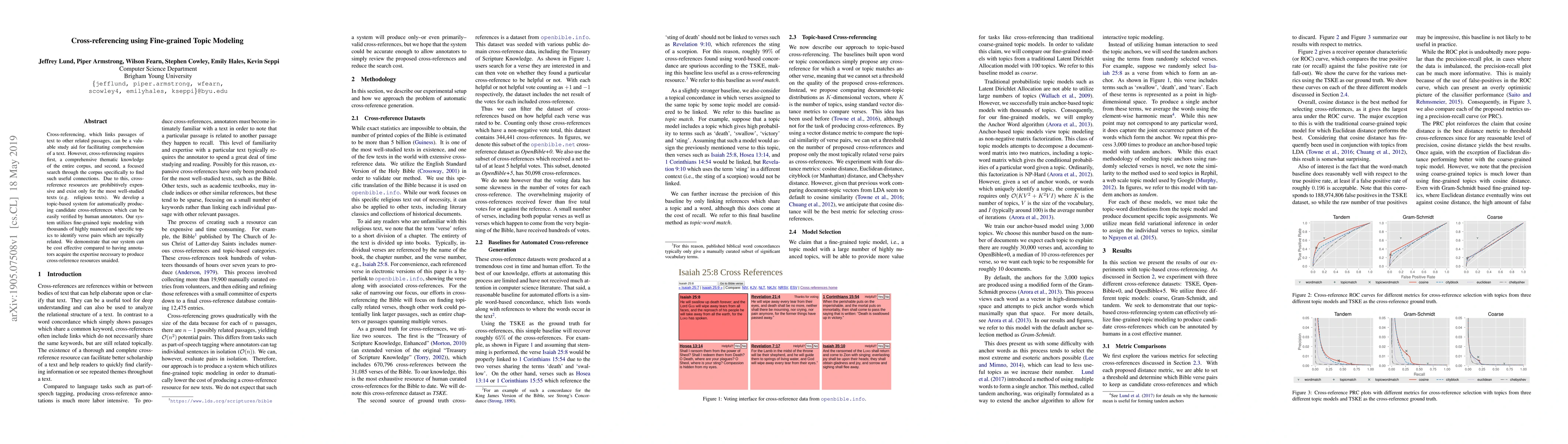 Cross-referencing, which links passages of text to other related passages, can be a valuable study aid for facilitating comprehension of a text. However, cross-referencing requires first, a comprehensive thematic knowledge of the entire corpus, and second, a focused search through the corpus specifically to find such useful connections. Due to this, cross-reference resources are prohibitively expensive and exist only for the most well-studied texts (e.g. religious texts). We develop a topic-based system for automatically producing candidate cross-references which can be easily verified by human annotators. Our system utilizes fine-grained topic modeling with thousands of highly nuanced and specific topics to identify verse pairs which are topically related. We demonstrate that our system can be cost effective compared to having annotators acquire the expertise necessary to produce cross-reference resources unaided.